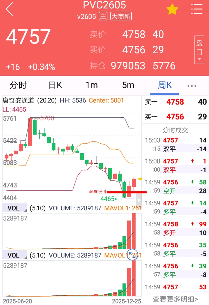 $PVC2605(DCE|v2605)$ 两个建材品种PVC和玻璃,周线结构上PVC近两周的触低反弹,结构上比玻璃还是要强PVC反复稳住了4680分水上方,而玻璃2605合约在1050分水上下反复多头对短期反弹还是犹豫不定。PVC周线整体要坚决点。所以激进PVC2605合约4680上午继续震荡反弹对待。玻璃2605合约观点还是之前不变,要反弹前提必须反弹站稳1050分水才能继续。