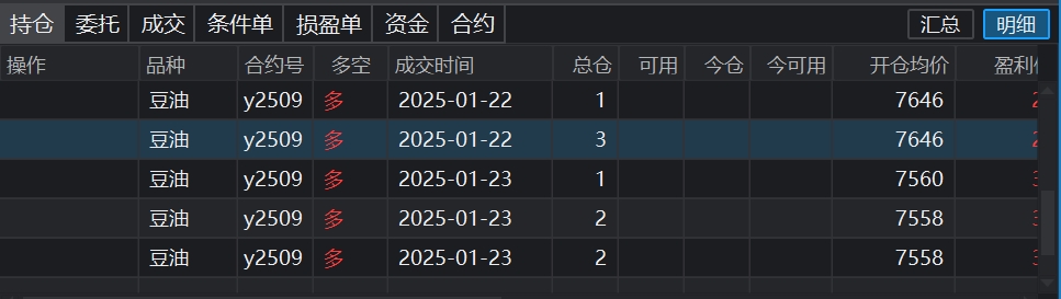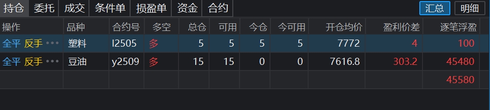 豆油的操作,目前多单一直在持有(波段,很少做日内),仓位目前30%左右,今天建仓了塑料多单底仓,操作如下图
