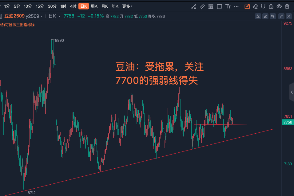 5-8豆油:受拖累,关注7700的强弱线得失