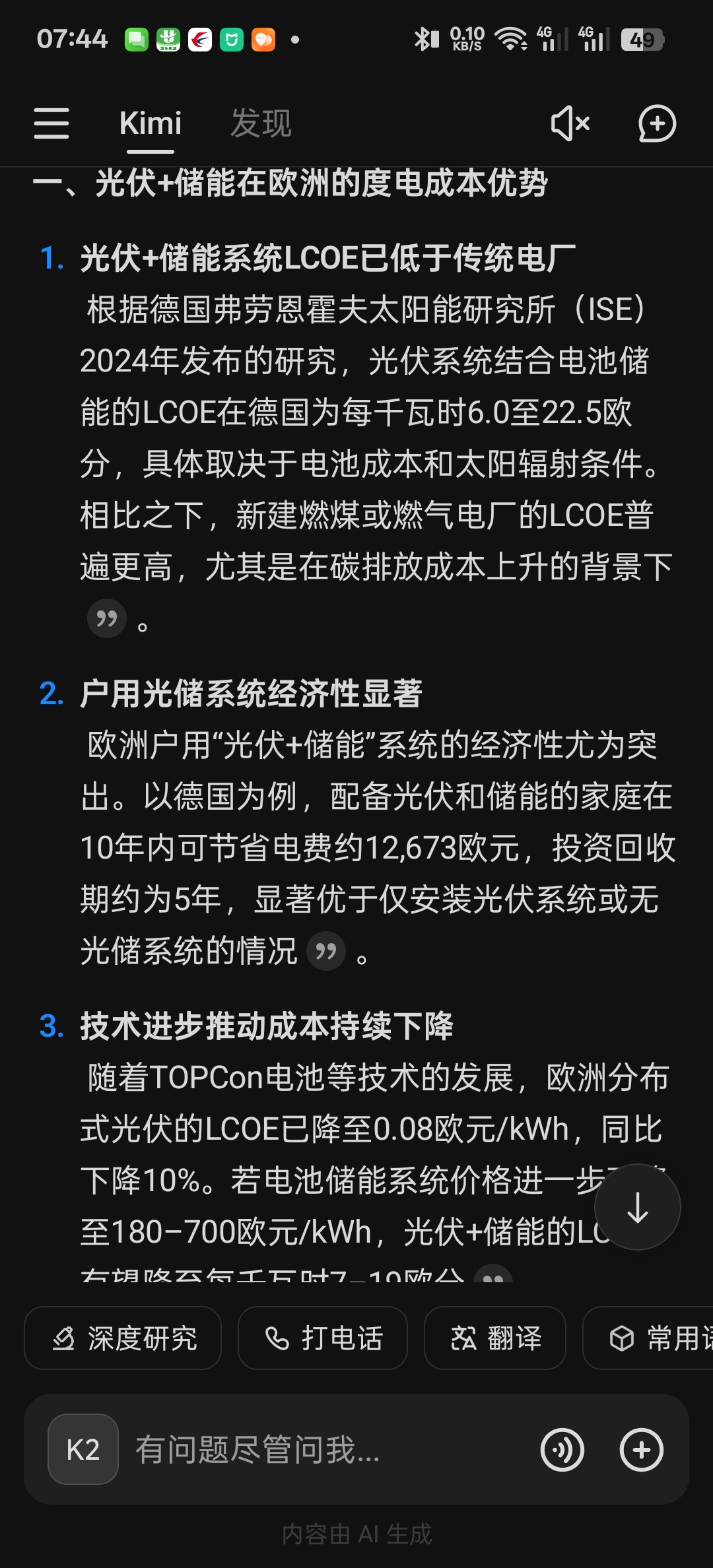 根据德国弗劳恩霍夫太阳能研究所(ISE)2024年发布的研究,光伏系统结合电池储能的LCOE在德国为每千瓦时6.0至22.5欧分,具体取决于电池成本和太阳辐射条件。相比之下,新建燃煤或燃气电厂的LCOE普遍更高,尤其是在碳排放成本上升的背景下$天华新能(SZ300390)$ $融捷股份(SZ002192)$ $盛新锂能(SZ002240)$