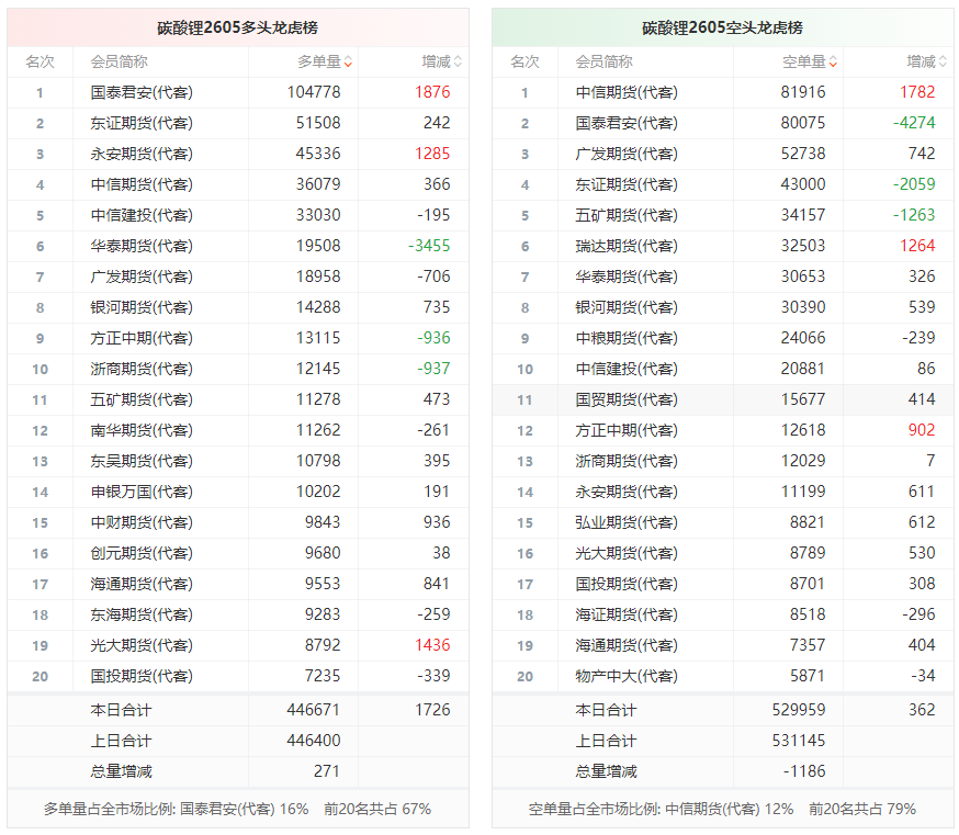 总体而言,碳酸锂2605合约今日减仓上行,多空持仓排名前20席中,多方呈进场态势,空方呈退场态势。