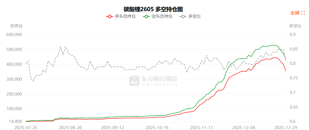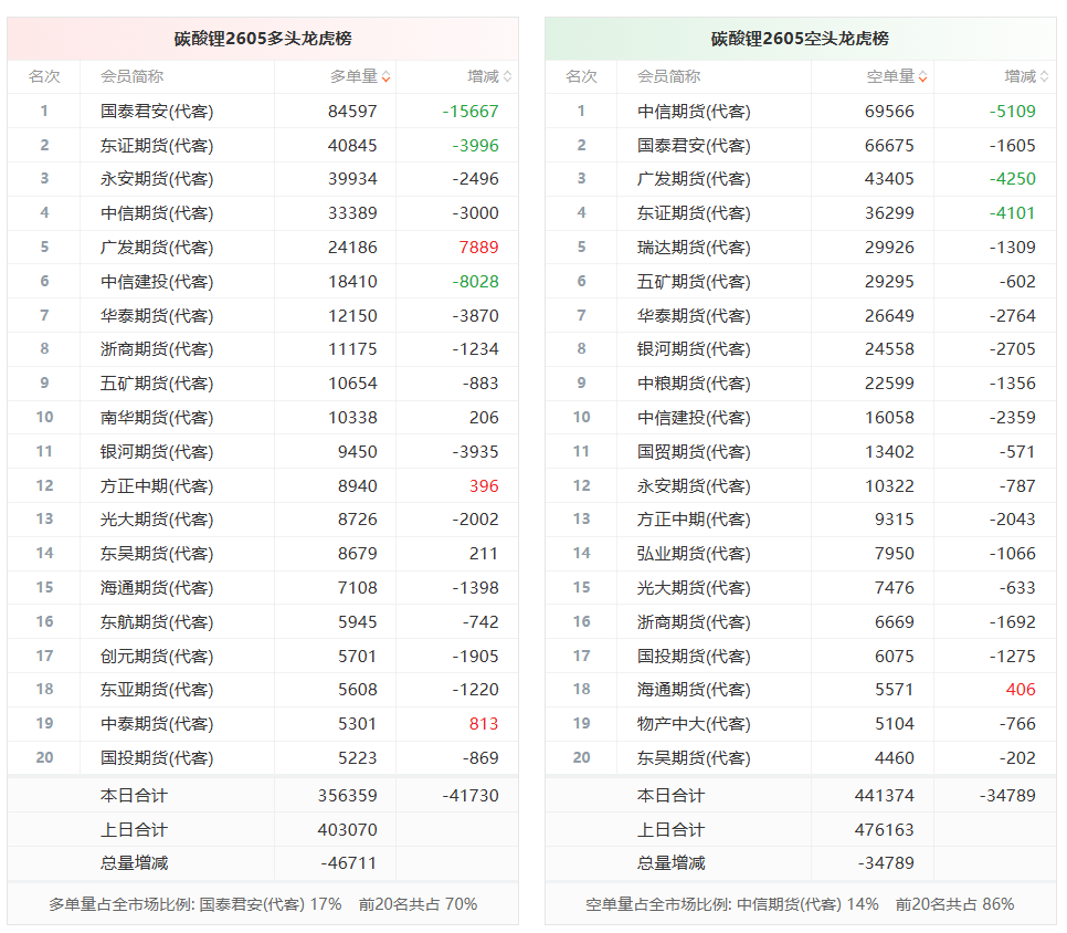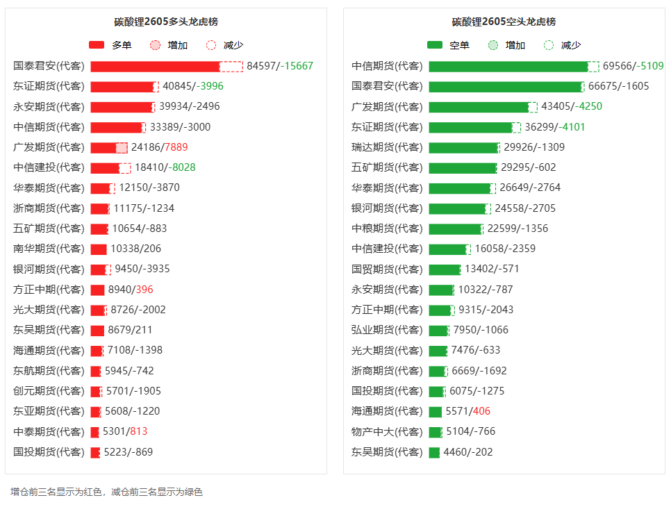 总体而言,碳酸锂2605合约今日减仓下行,多空持仓排名前20席中,多空双方均呈退场态势,多头退场意愿强于空头。