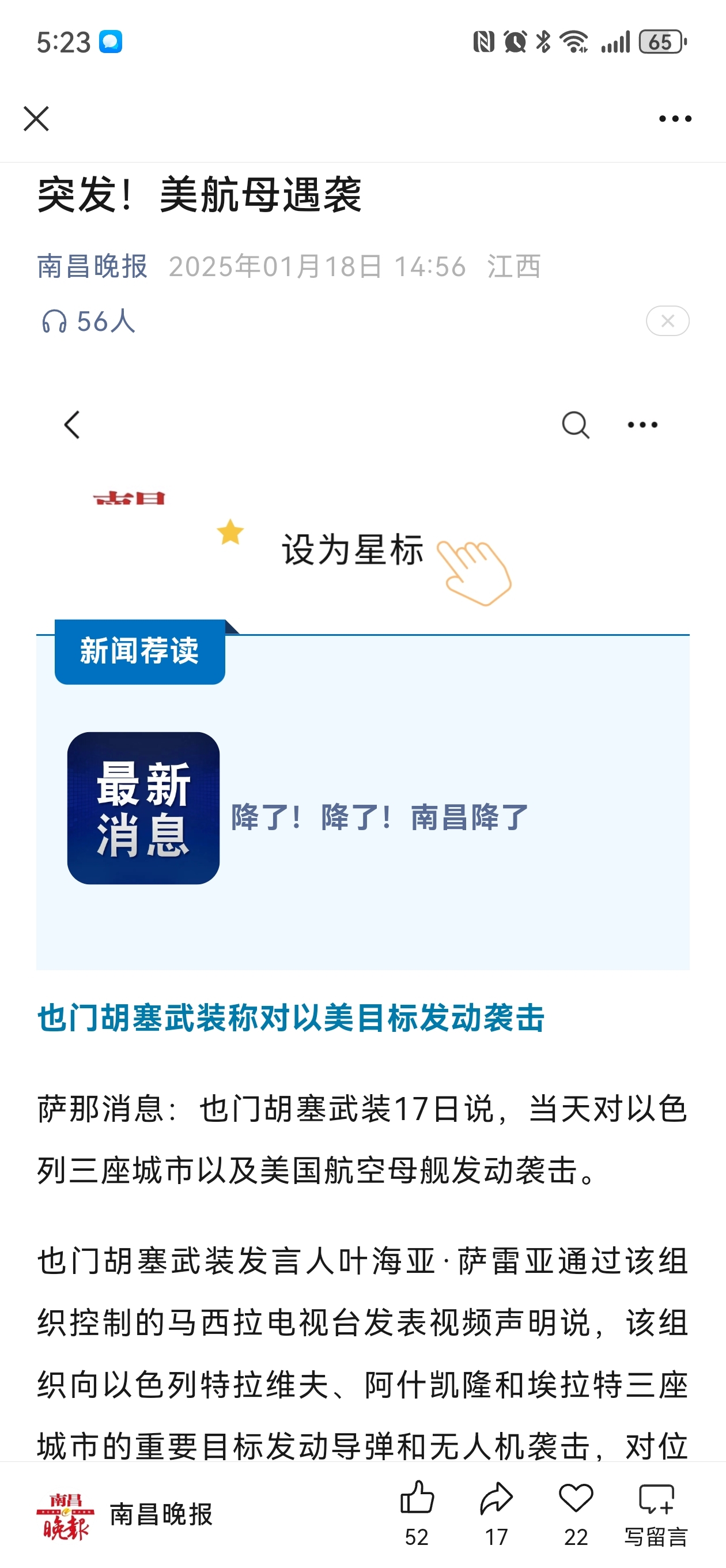 $欧线集运2502(INE|ec2502)$ 也门胡塞武装称对以美目标发动袭击萨那消息:也门胡塞武装17日说,当天对以色列三座城市以及美国航空母舰发动袭击。也门胡塞武装发言人叶海亚·萨雷亚通过该组织控制的马西拉电视台发表视频声明说,该组织向以色列特拉维夫、阿什凯隆和埃拉特三座城市的重要目标发动导弹和无人机袭击,对位于红海的美国“哈里·杜鲁门”号航空母舰发动新的袭击。
