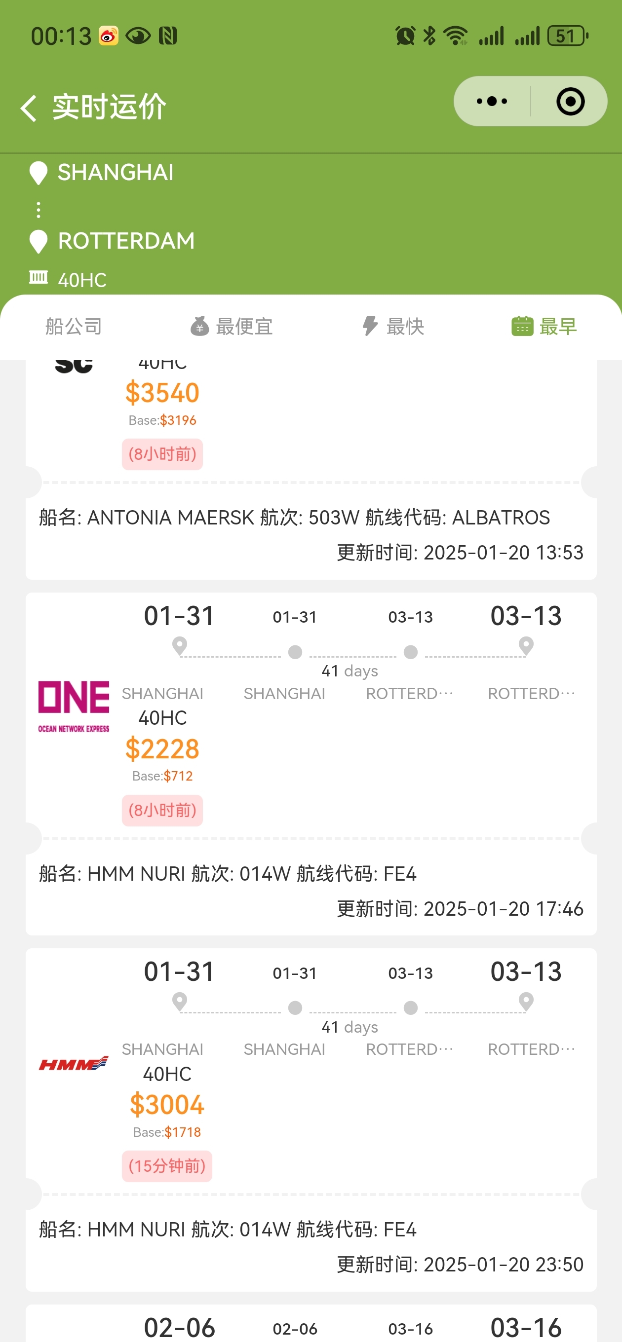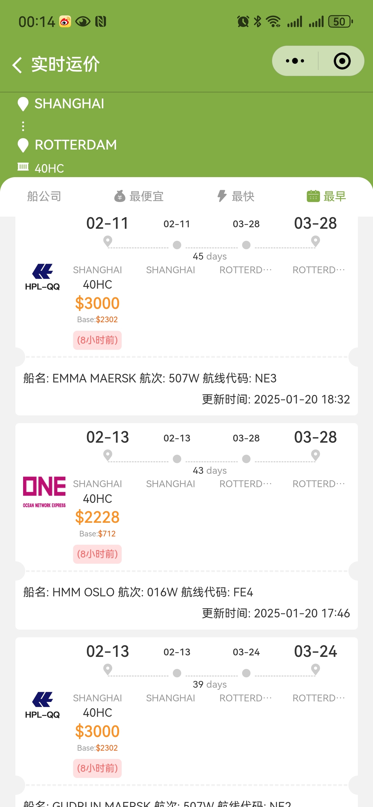 $欧线集运2502(INE|ec2502)$ 1月25日,1月31日,2月13日。这三个日期的低价船,会进入到三期的交割指数计算里面吗?懂得大神帮大家分析确认一下呢!one的低价,确实一会儿有,一会儿没的,先不管他真假,咱们先一起讨论下,会不会被记入到结算指数里。