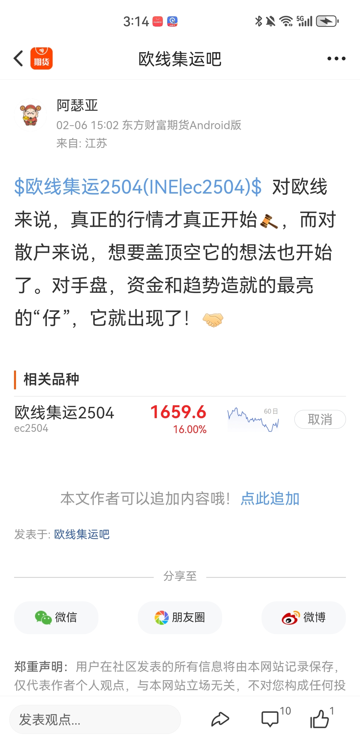 温馨提示: 1.根据《证券法》规定,禁止编造、传播虚假信息或者误导性信息,扰乱证券市场;2.用户在本社区发表的所有资料、言论等仅代表个人观点,与本网站立场无关,不对您构成任何投资建议。用户应基于自己的独立判断,自行决定证券投资并承担相应风险。《东方财富社区管理规定》