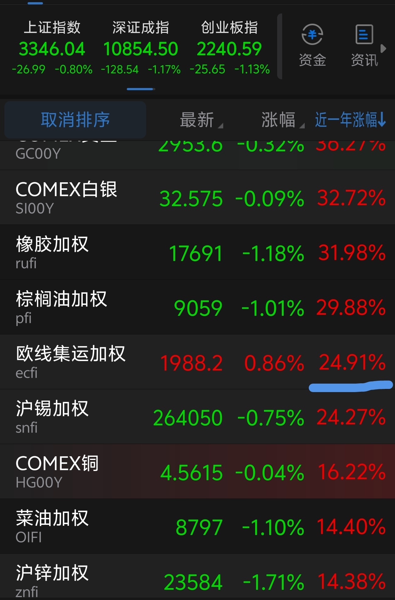 $欧线集运2506(INE|ec2506)$ 目前欧线集运期货价格比去年同期高出24.91%。没想到散多们还是这么亢奋。