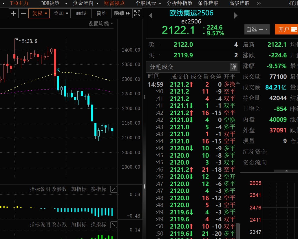 $欧线集运2504(INE|ec2504)$ 感谢欧线让我这个月盈利43万多,今年目标已完成,祝愿兄弟们都能在这个品种上挣到自己满意的答案,明天只剩下10分一仓位在操作一天就休息一段去旅游,顺便总结一下这段时间的得与失,4月在战,看到有人说现在还是多头趋势,那么我免费分享就当感谢兄弟们的陪伴了,下图是06的趋势图,明显主力资金在出,散户资金在进在接盘,没有意外这段时间还是震荡下跌的,盼多单的兄弟们先离场,在更低位置在低多吧