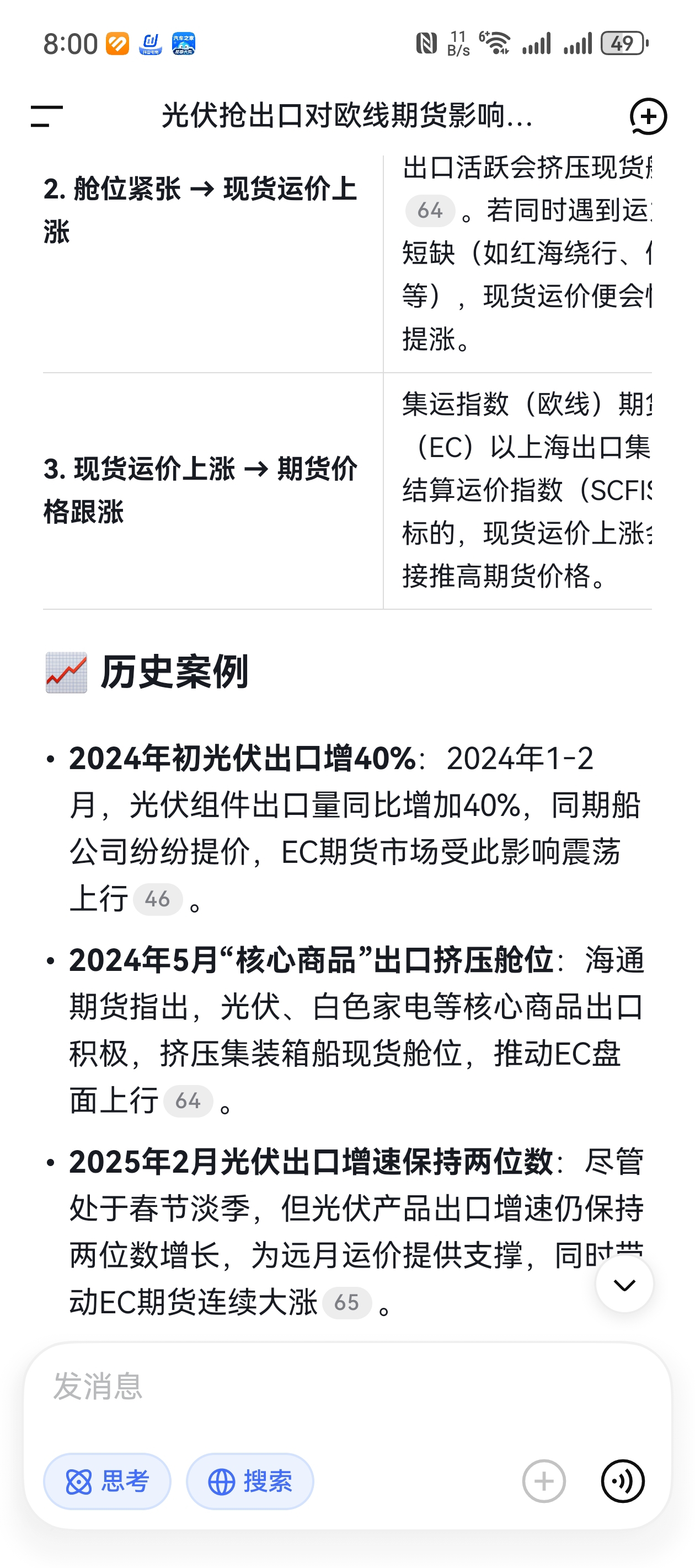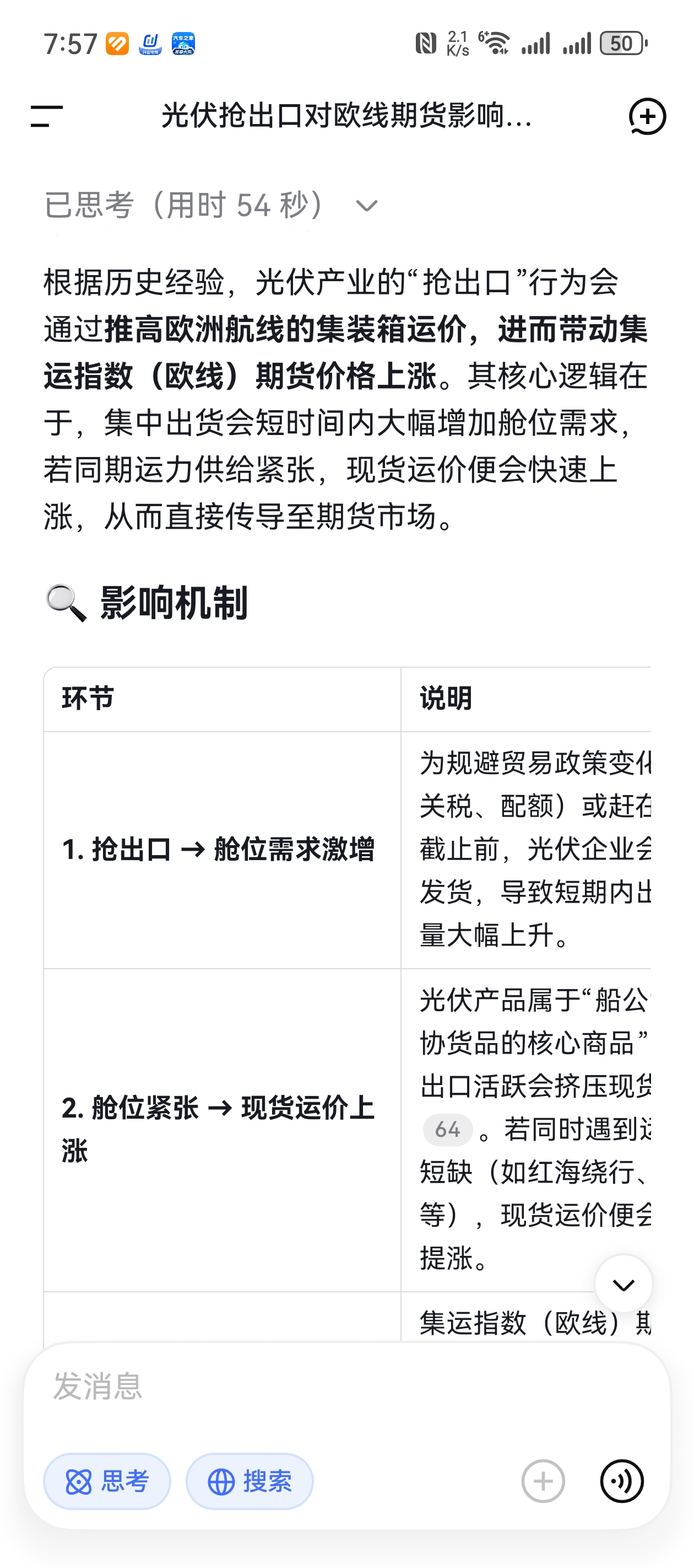 $欧线集运2602(INE|ec2602)$ 光伏抢出口对欧线会造成直接的影响。就拿最近的一次抢出口来说从2025年的2月-5月份光伏开始抢出口。欧线从1200点涨到了4230点。历史往往都会重现。这次是从1月份到4月份。后期爆发力不可小觑。这波搞不好从1700点涨到5000点。