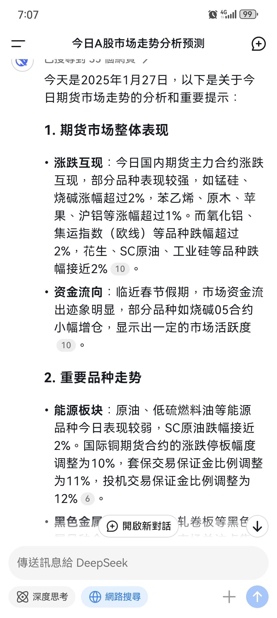 $原油2503(INE|sc2503)$ deepseek 预测一下今天期货走势 看来ai的算法量化能不能预测到今天的走势