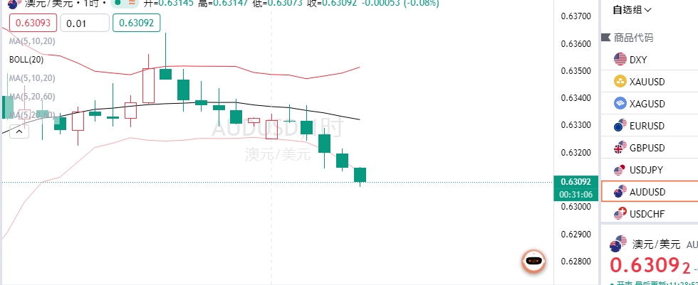 澳元一小时布林带触及下轨,0.630多单进场,短线看300点.
