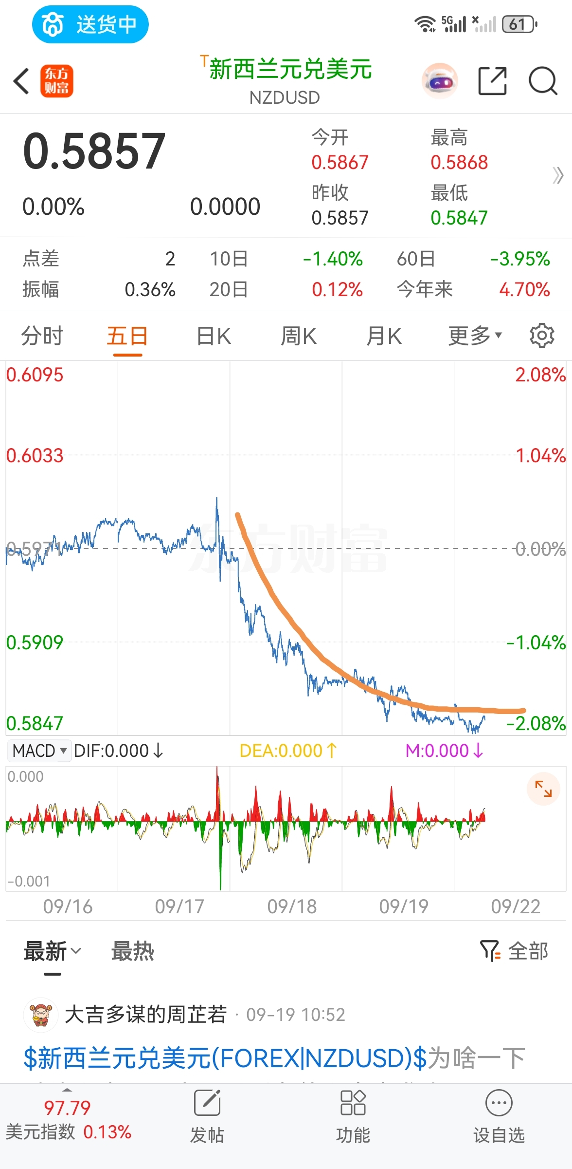 $新西兰元兑美元(FOREX|NZDUSD)$ 新西兰元相比欧元,应对美元短期走强的势头,更敏感。碗底形态已成,大概率反弹,恢复0.5980。届时,美元下跌至96.2。市场必然回归均值。