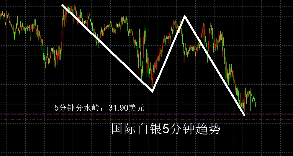 国际白银经过连续回撤之后,目前已经回踩到了5分钟级别上涨趋势的最后防线31.90
