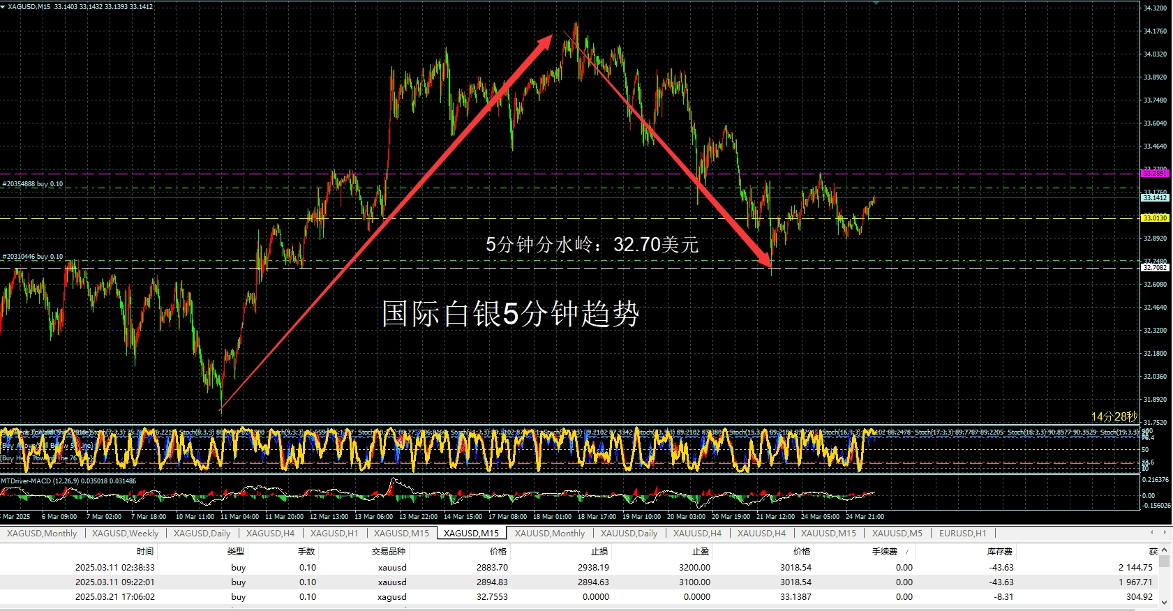 国际白银目前仍然是5分钟级别的上涨趋势,分水岭32.70美元没有发生任何实质性的