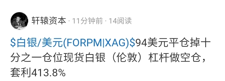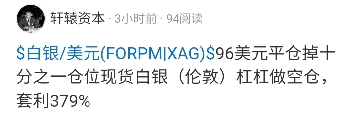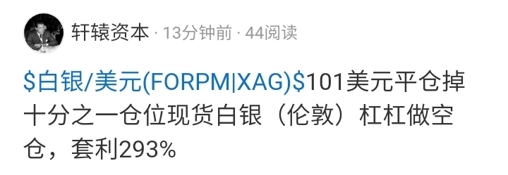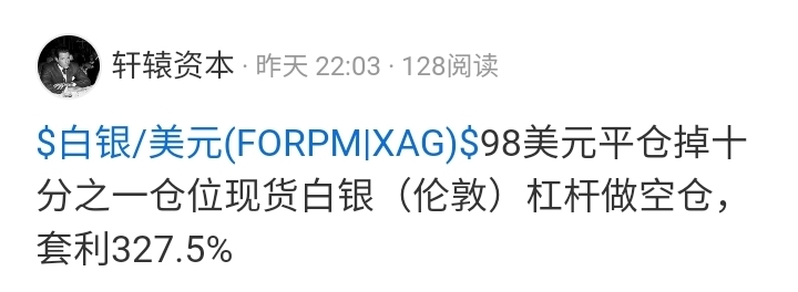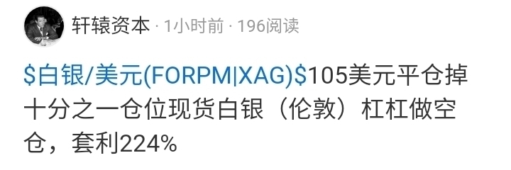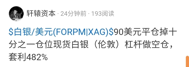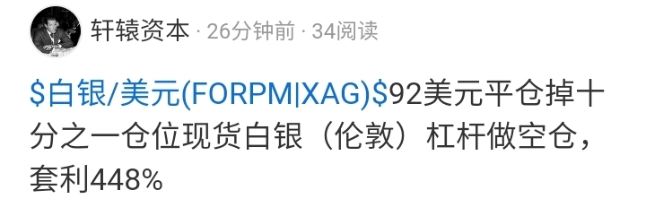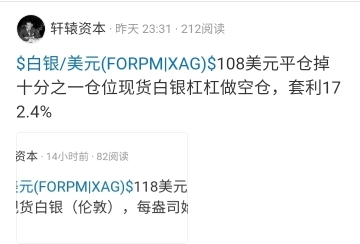 $白银/美元(FORPM|XAG)$ 87美元平仓掉剩余最后十分之一仓位现货白银(伦敦)杠杆做空仓,套利534.4%
