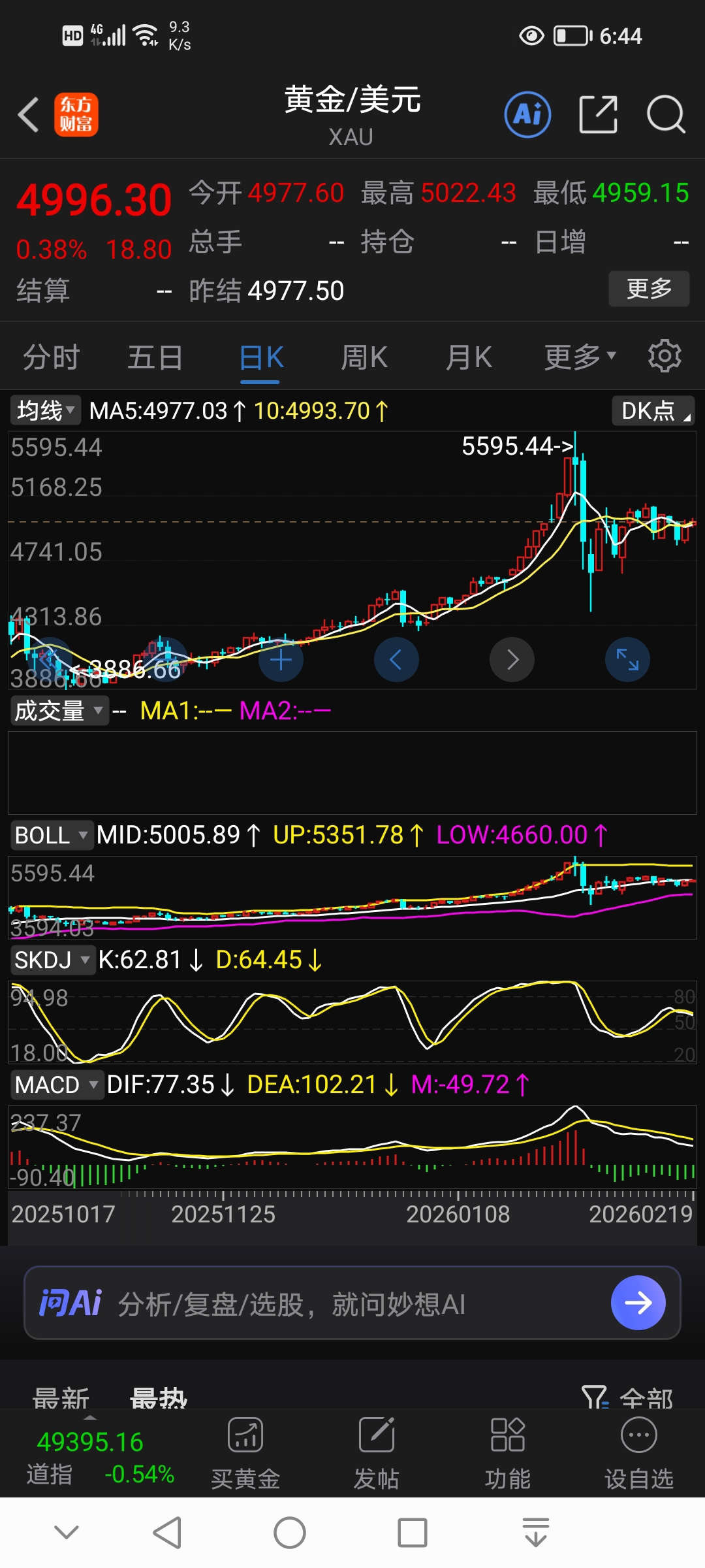 趋势状态:金价仍处于上升通道内,4950美元上方结构保持完整。从截图数据看,MA5(5日均线)位于4977.03美元且向上,MA10(10日均线)位于4993.70美元且向上,短期均线呈现金叉后多头排列,支持进一步上行。