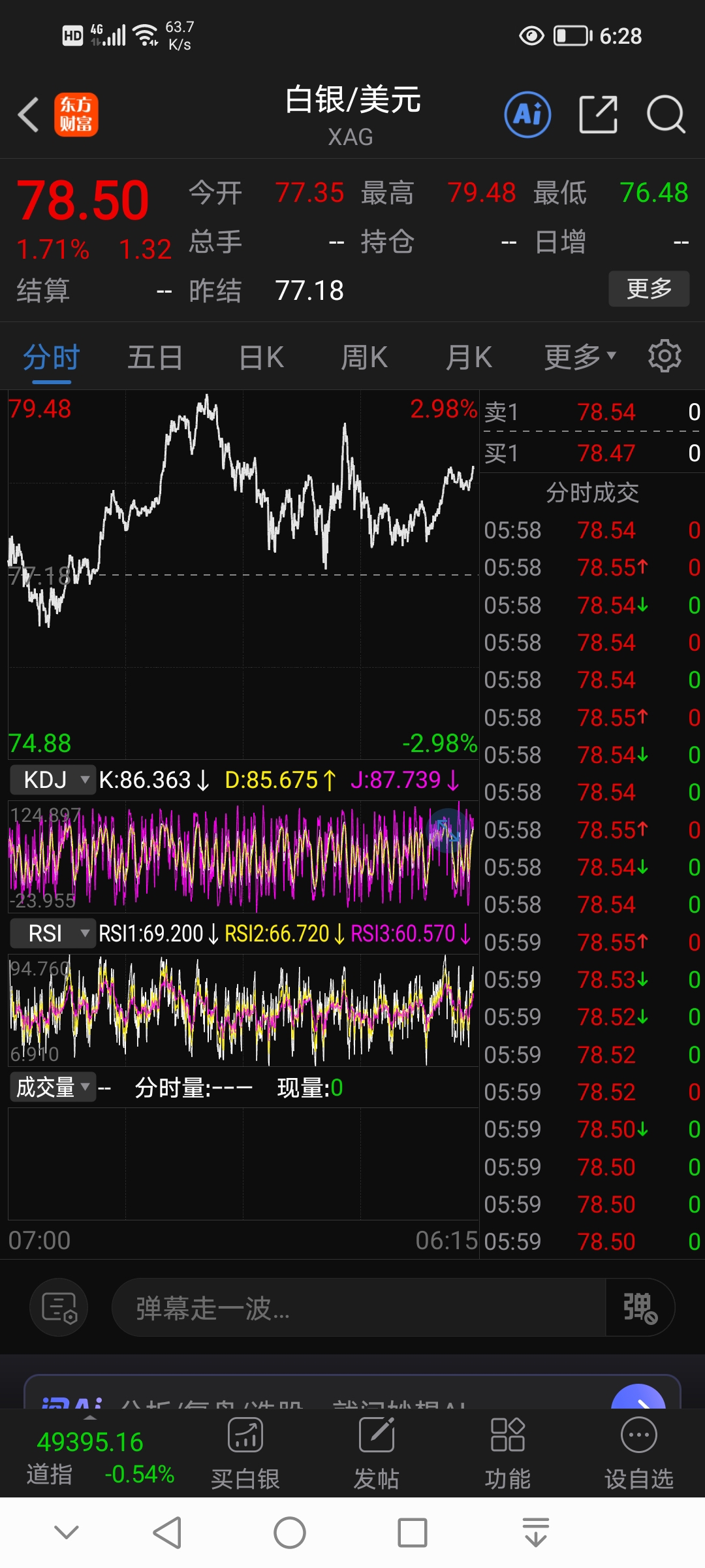 国际现货白银(XAGUSD):报收78.50美元/盎司,上涨1.71%(+1.32美元)。白银表现更为强势,盘中最高冲至79.48美元,最低76.48美元。