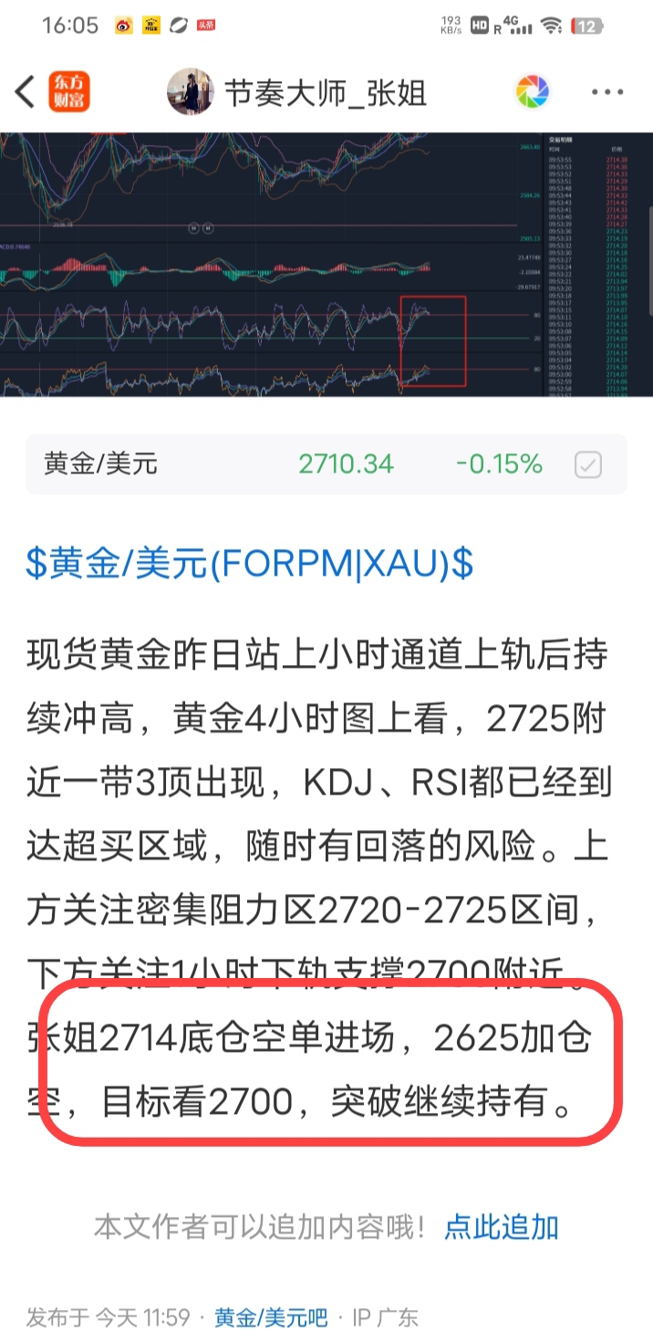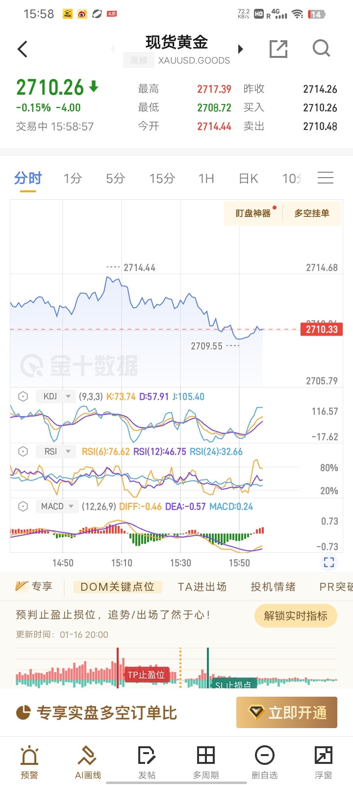 午后黄金慢跌,张姐早盘2714空,现价2710,目前,浮盈4美金继续持有,超短线