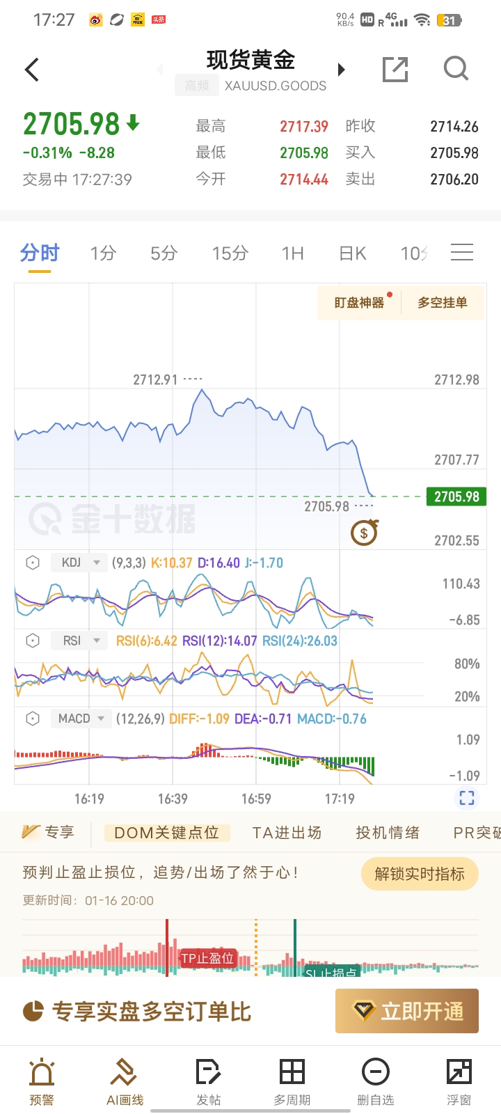 欧盘黄金延续慢跌,张姐2714空,现价2706短线减仓止盈拿下8$行情,底仓持有