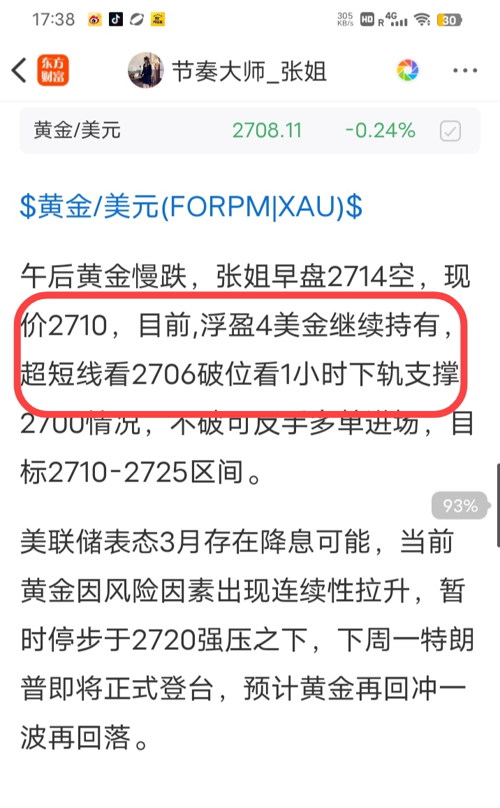 欧盘黄金延续慢跌,张姐2714空,现价2706短线减仓止盈拿下8$行情,底仓持有波段看2700