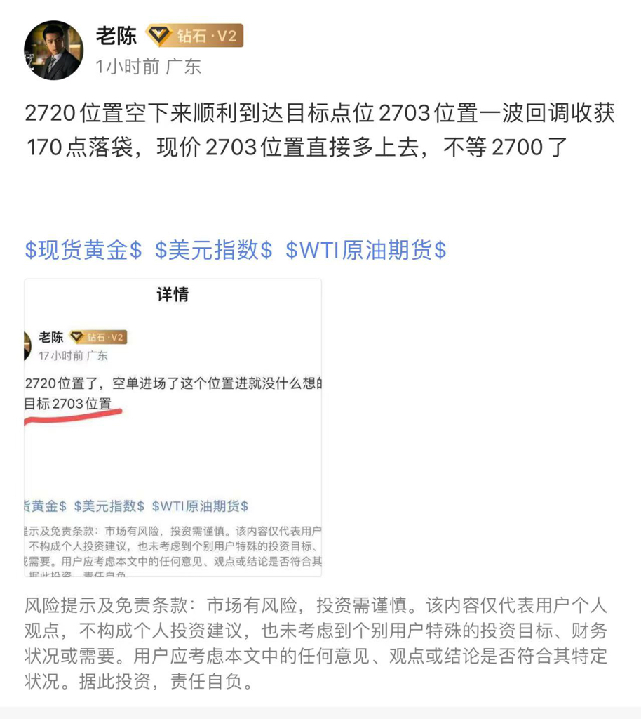 2703的多单上来2710位置7美金的利闰,可以减仓设置保本损继续上看2725目