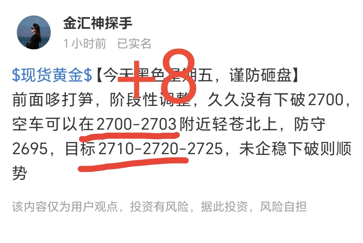 2703附近哆的朋友们,到2711可以小收8个点,标准一手800美刀落袋为安,稳健全部下车离场了,迟迟未上破2712压力,如果今晚不突破2700去下方,预计2700-2712区间的震荡,如果突破2700下方往下就应该有一个小瀑布