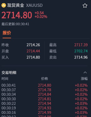 黄金美盘行情探底回升之后完全一路不回头,2714空最低下跌至2710反弹,现在单