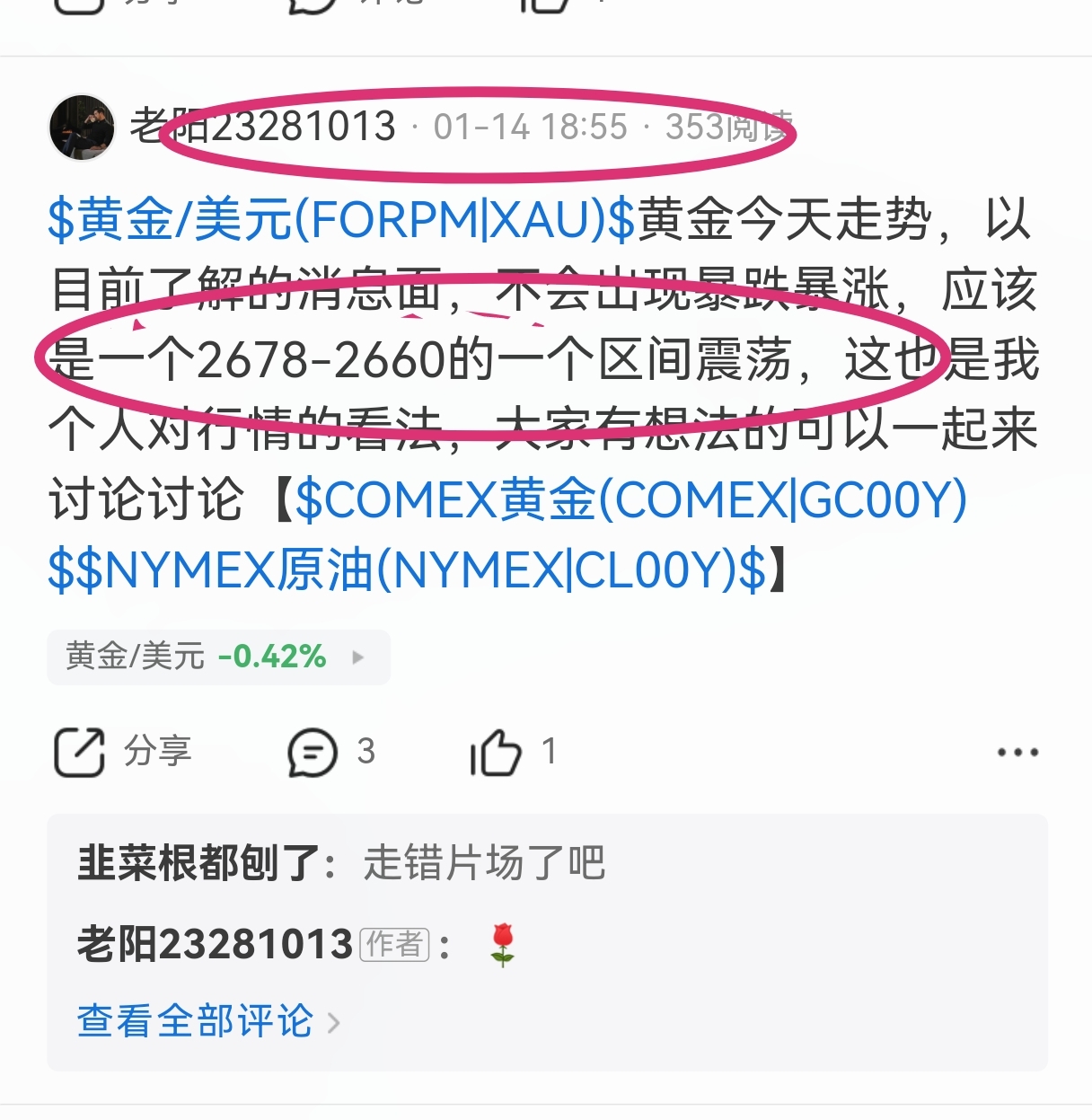 $黄金/美元(FORPM|XAU)$ 本周2 大黄周一回调至2660就在无下滑,那么老阳给的看法就是,今天行情将是区间震荡,给出2660-2678震荡,那么一天都未突破2675,也就是说你无需担心割肉的担忧,悟性好的就是上下来回刷,上就空下就多【$COMEX黄金(COMEX|GC00Y)$ $NYMEX原油(NYMEX|CL00Y)$ 】