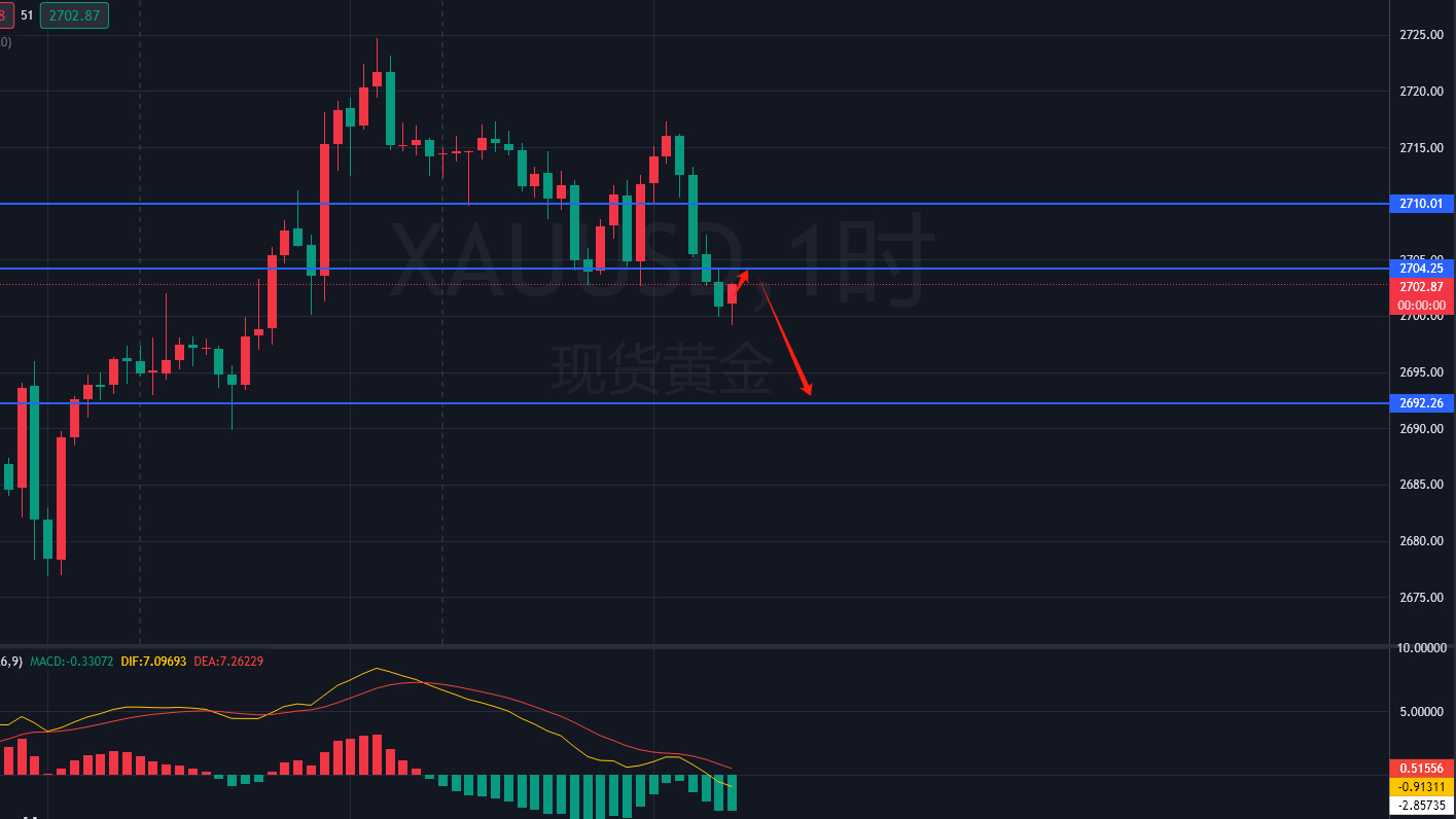 $黄金/美元(FORPM|XAU)$ 黄金本周最高来到2724,最低来到2656,收线在2702,本周进场的位置均收获不错,周一在承压2693后下跌至2656后开始连阳,低点不断抬高,周五止步下跌,那么下周的思路上周一我们需要关注行情承压和支撑的情况,一小时级别上方压力2704,2710,下方2697,2692,如能跌破2692后反弹不能站稳,看好黄金延续下跌至2670-2660