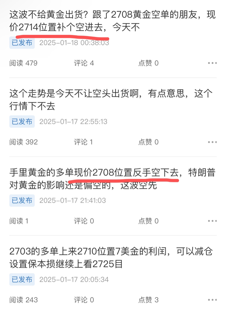 上周五已经很明确的讲了,黄金必然是要往下走,周五不让出货还在拉高的话不过是吓走一批不坚定的人,2708/2714走到2690顺利到达目标点位一单获利400点!!不是没有利润,只是你不够坚定