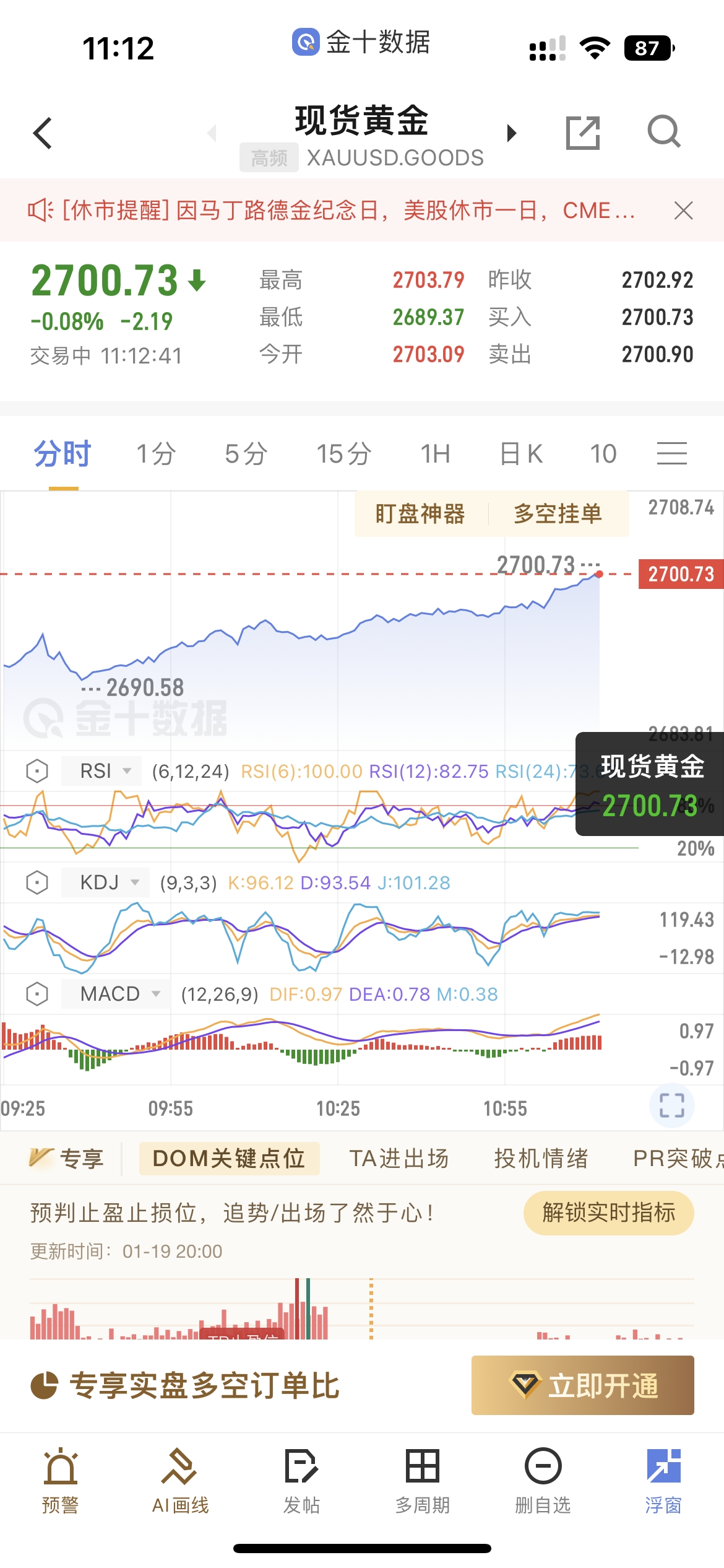 上周五张姐提示特朗普上台后开启空头模式,加上停火协议,今日开盘就开跌。张姐操作建议高空为主低多为辅。上方压力关注1小时上轨2705-2710,若被多头拿下2713,则重点关注2725-2730区域,此处是上周高点承压,也是当前技术形态的密集阻力区域,下方支撑重点关注4H布林带下轨2675-2680情况。张姐在现价2700底仓空进场,上方2708附近加仓空。