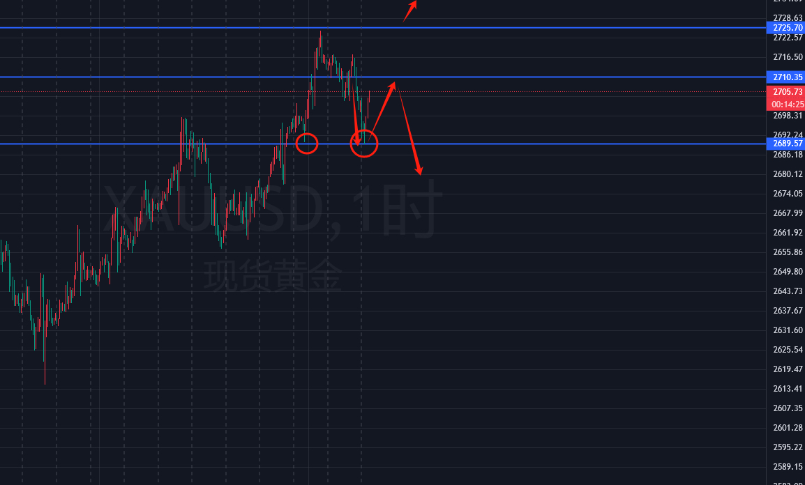 $黄金/美元(FORPM|XAU)$ 周一向下试探2690后反弹,目前又一次承压2704压力,和周末的分析差不多,开盘后没能向上而选择下破,后续反弹的力度也符合预期,也在支撑位进场多单,川普上台之后看政策如何,高于预期还是低于预期,大波动肯定要来了,目前可等待2705-2710压力参与空单,行情向上突破则需要看2726破位跟进,跌破2688则有望看向2670,欢迎关注,会及时更新