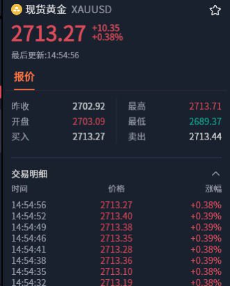 $黄金/美元(FORPM|XAU)$ 午间空单扫损之后,及时在2704做多看涨,现在2713平仓,再等机会布局,行情波动很快,大家严格控制风险。理性看待行情!