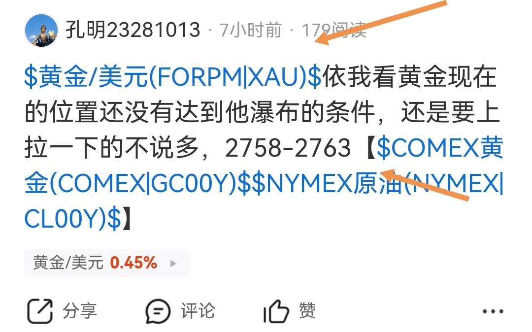 $黄金/美元(FORPM|XAU)$ 上午有给你们说拿个瀑布,那么点位也是如期拉上来了,当然有在这个区间进的,仓位控制好,有可能不是最高位,要有耐力和抗压能力,是长线【$COMEX黄金(COMEX|GC00Y)$ $NYMEX原油(NYMEX|CL00Y)$ 】
