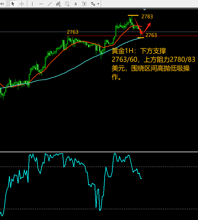 日线图来看,早间金价快速下跌到2763美元,刚好到前一日的高点,周五大涨的起涨点低点再2751-2753美元,MA5日均线2760-2763美元低点守住继续主多,操作上今日方向依然还是偏向做多,顺势而为,上方阻力做空位置突破2780上方高点到2783-85美元再伺机布局;