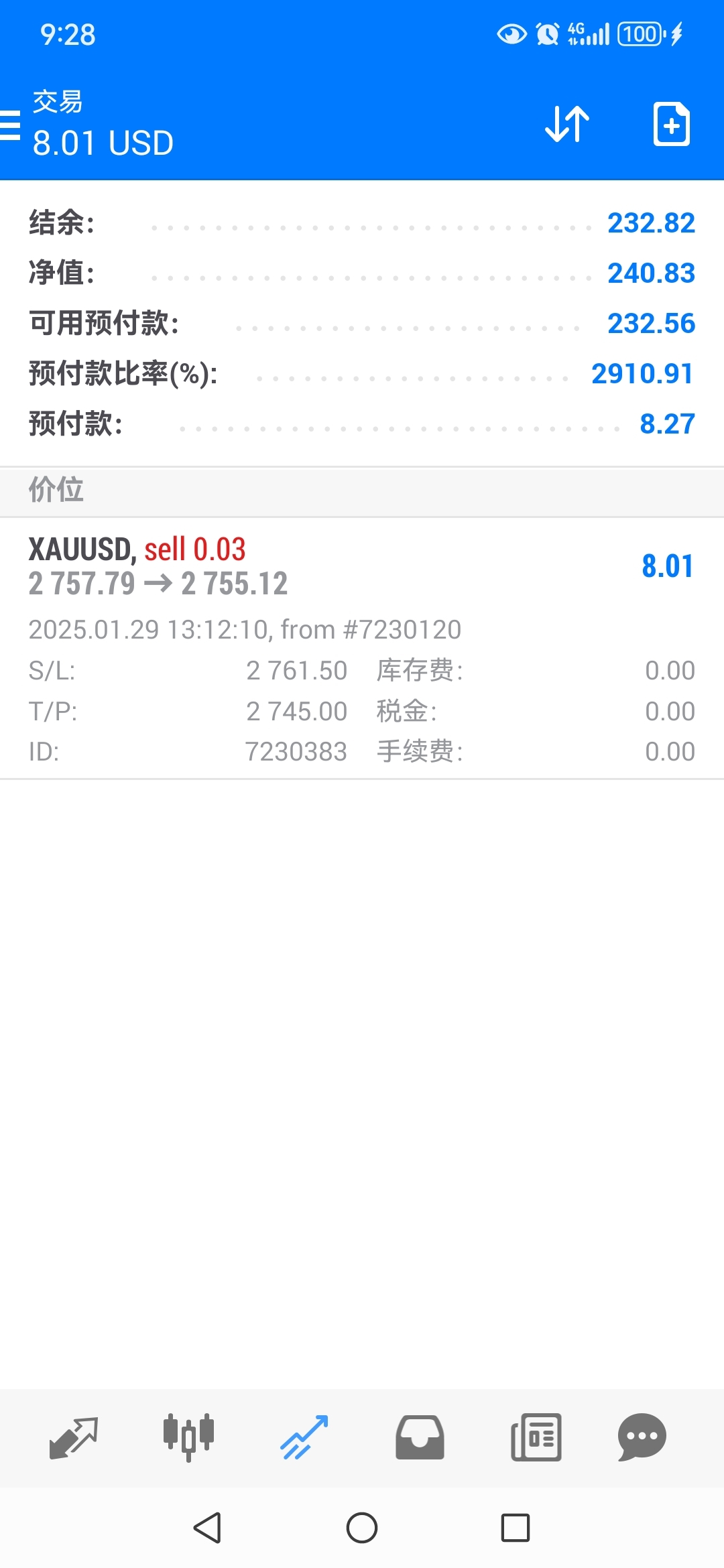 现在北京时间21:44分XAU黄金价格指数是2758【假设0.03手止损】在2762那么我就亏损12美元指数,【利润是32-12=20】