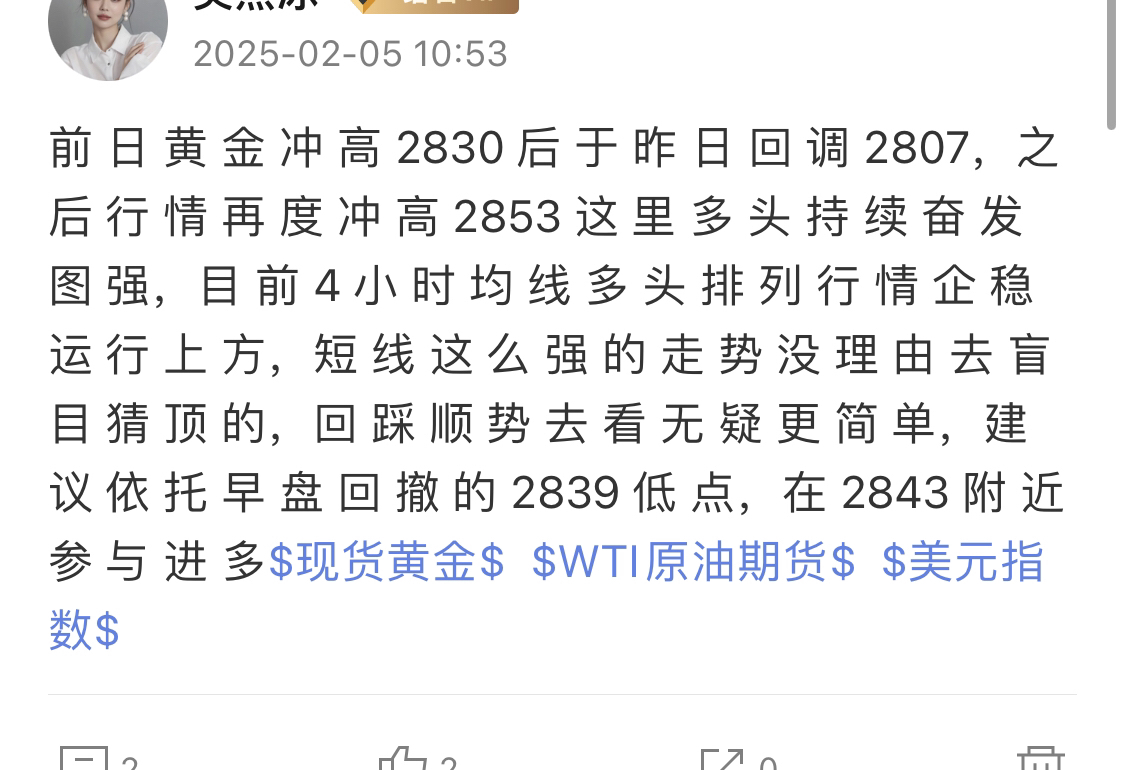 $黄金/美元(FORPM|XAU)$ 现 在 黄 金 没 有 多 少 回 调 ,高 位 代 替 修 正 后 就 继 续 冲 高 了,多 头 强 势,行 情 已 企 稳 小 时 均 线 向 上 运 行,前 面 进 多 位 置 稳 健 了 些 不 定 能 给 到,接 下 来 给 到 2852-50 这 里 可 追 一 次 看 2865 附 近