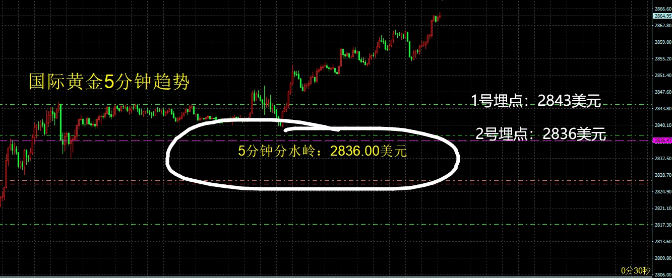 $黄金/美元(FORPM|XAU)$ 国际黄金连续创出新高,并且已经抵达到了我们昨天所讲的2866美元目标位了。此时国际黄金5分钟级别上涨趋势分水岭上移到2836美元。接下来,如果回调,红茶仍然继续加仓多。