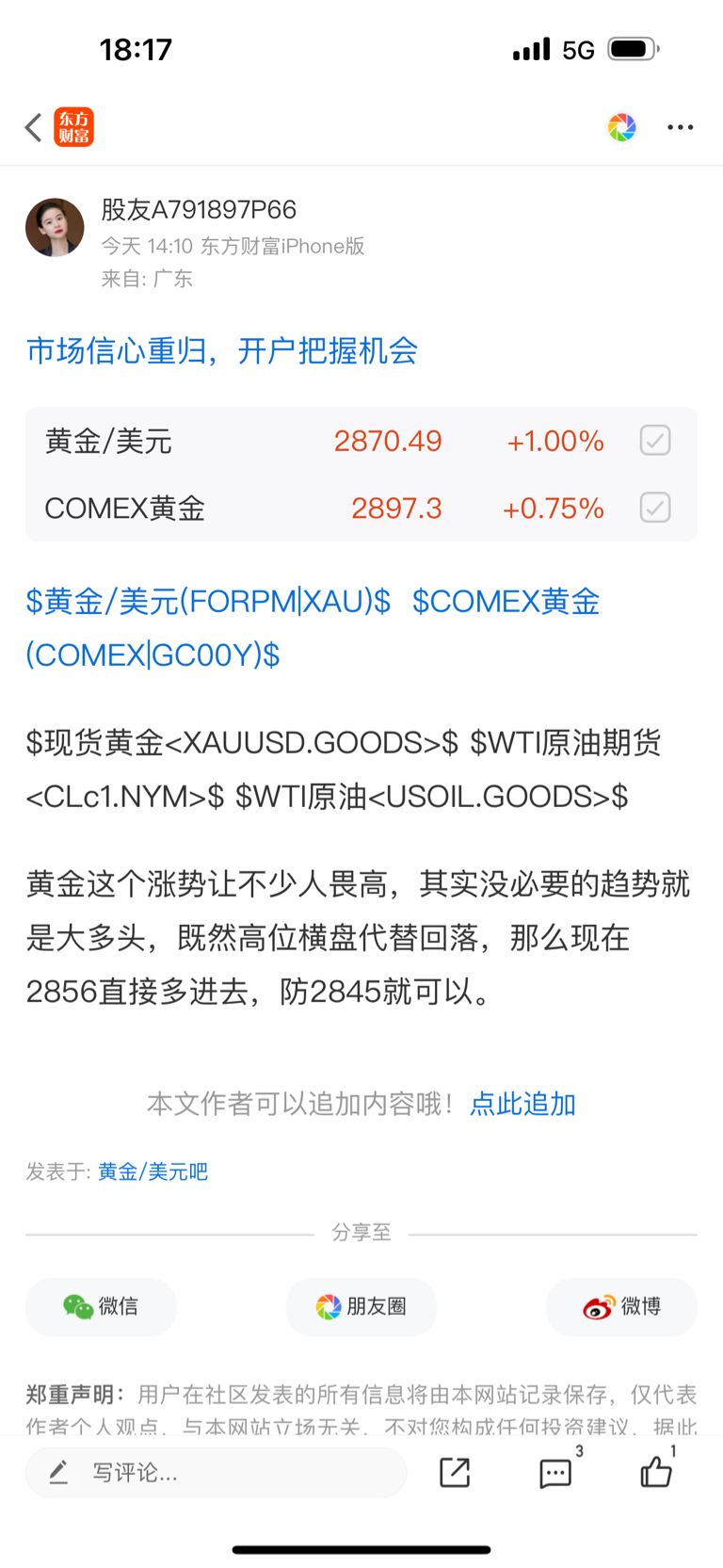 $现货黄金$$WTI原油期货$$WTI原油$黄金不需要畏高,2856直接多现在2