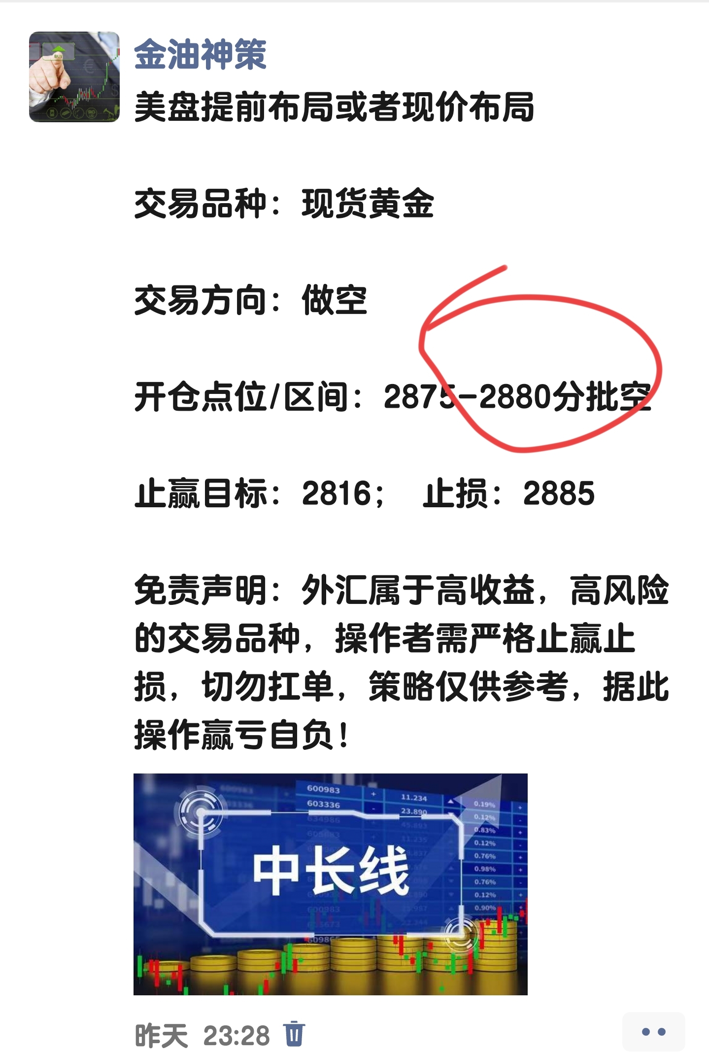 提示:黄金现报2834一线,隔夜布局2880中线空单,建议稳健获46美金全部离场