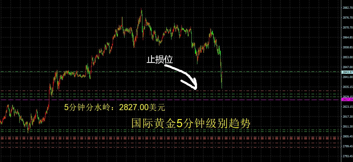 国际黄金5分钟级别的第一个点入场了,此时我的止损调整到了小前低下方的位置!接下来