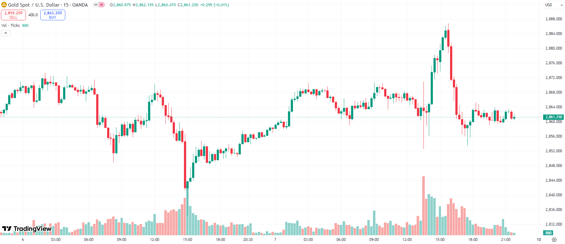 周五非农数据波动上下扫,多空双插现象。非农数据破位新高至2886位置附近,趋势线