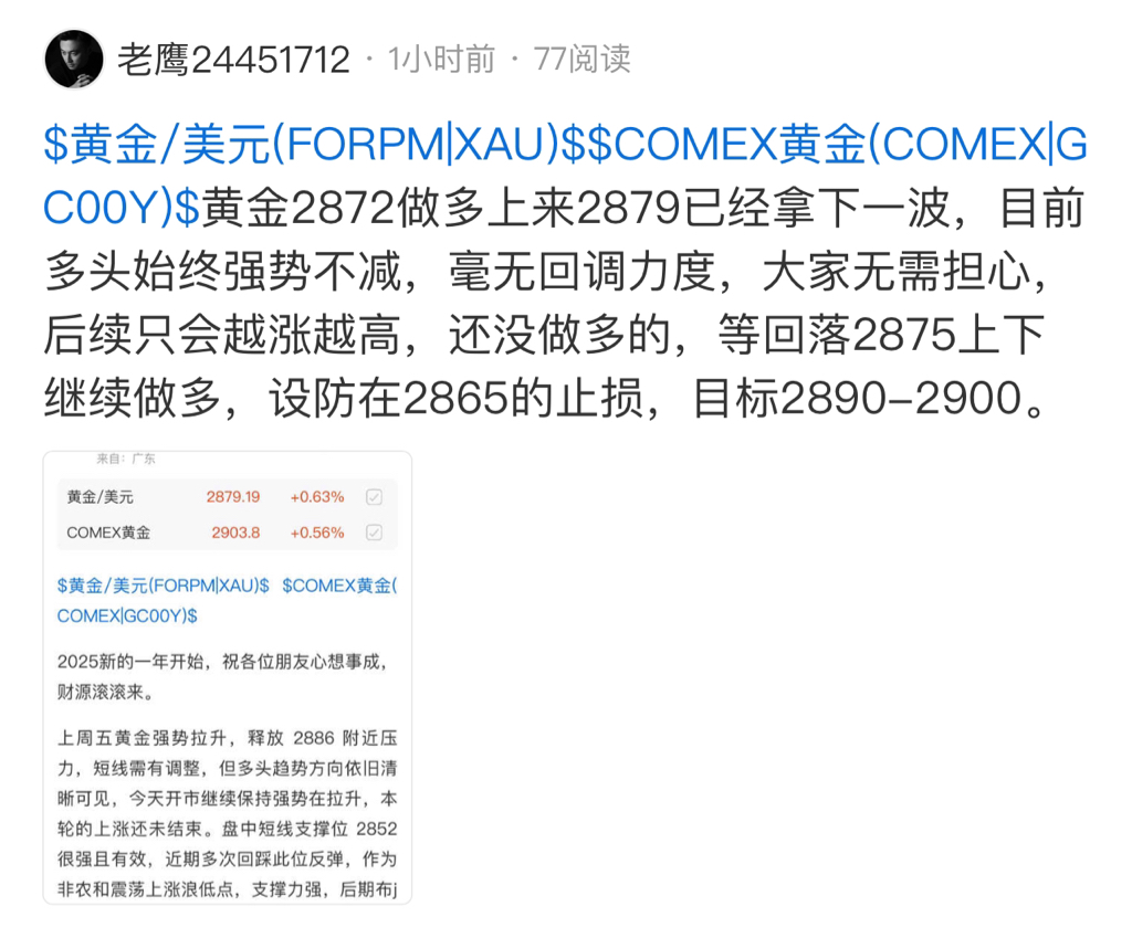 $黄金/美元(FORPM|XAU)$ $COMEX黄金(COMEX|GC00Y)$ 黄金让 2875上下做多,转眼间就拉到了 2885 ,这一波反复筑底就是为了再次冲击新高,别以为位置高就不敢动手,决定因素是趋势不是点位,现在是不是后悔都来不急了?