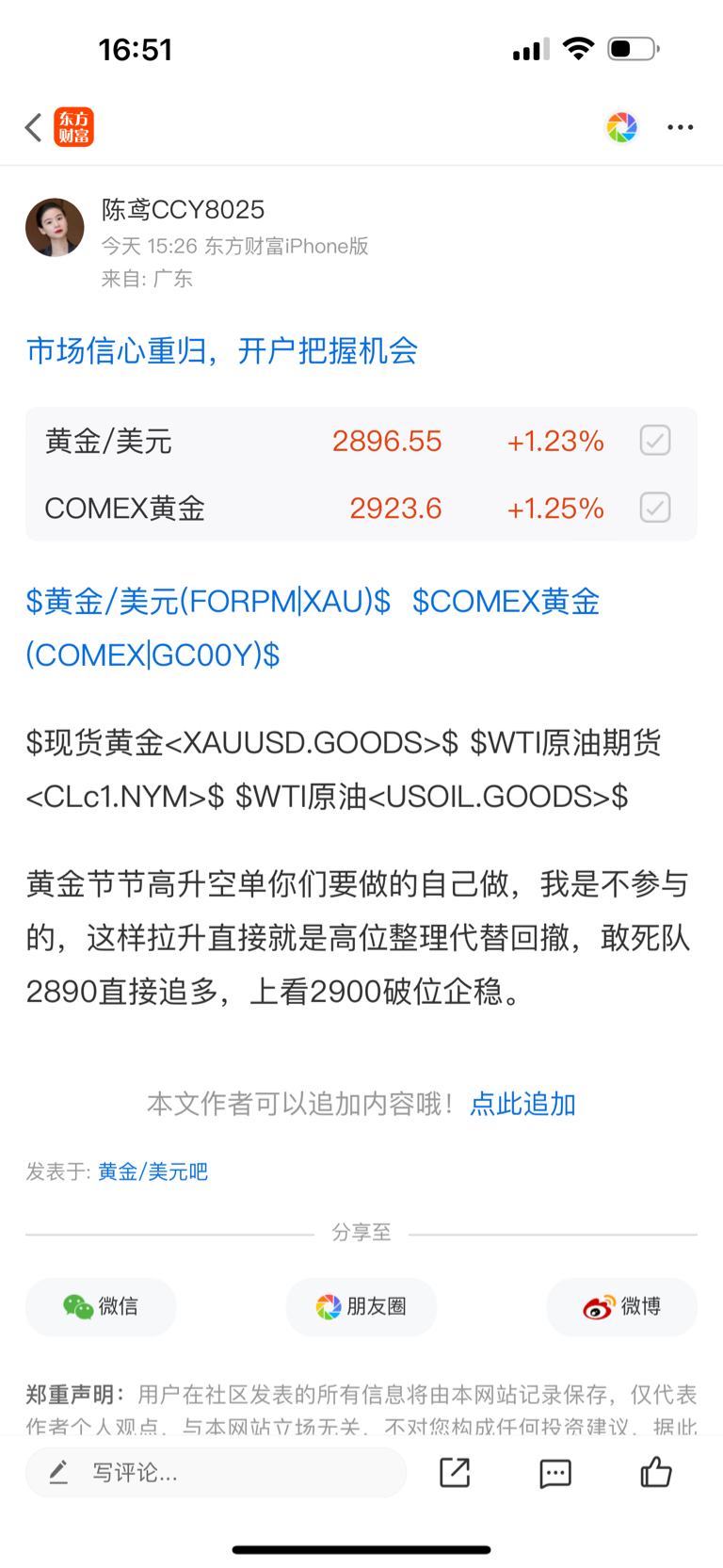 $现货黄金$$WTI原油期货$$WTI原油$黄金2890追多毫无问题,2898又