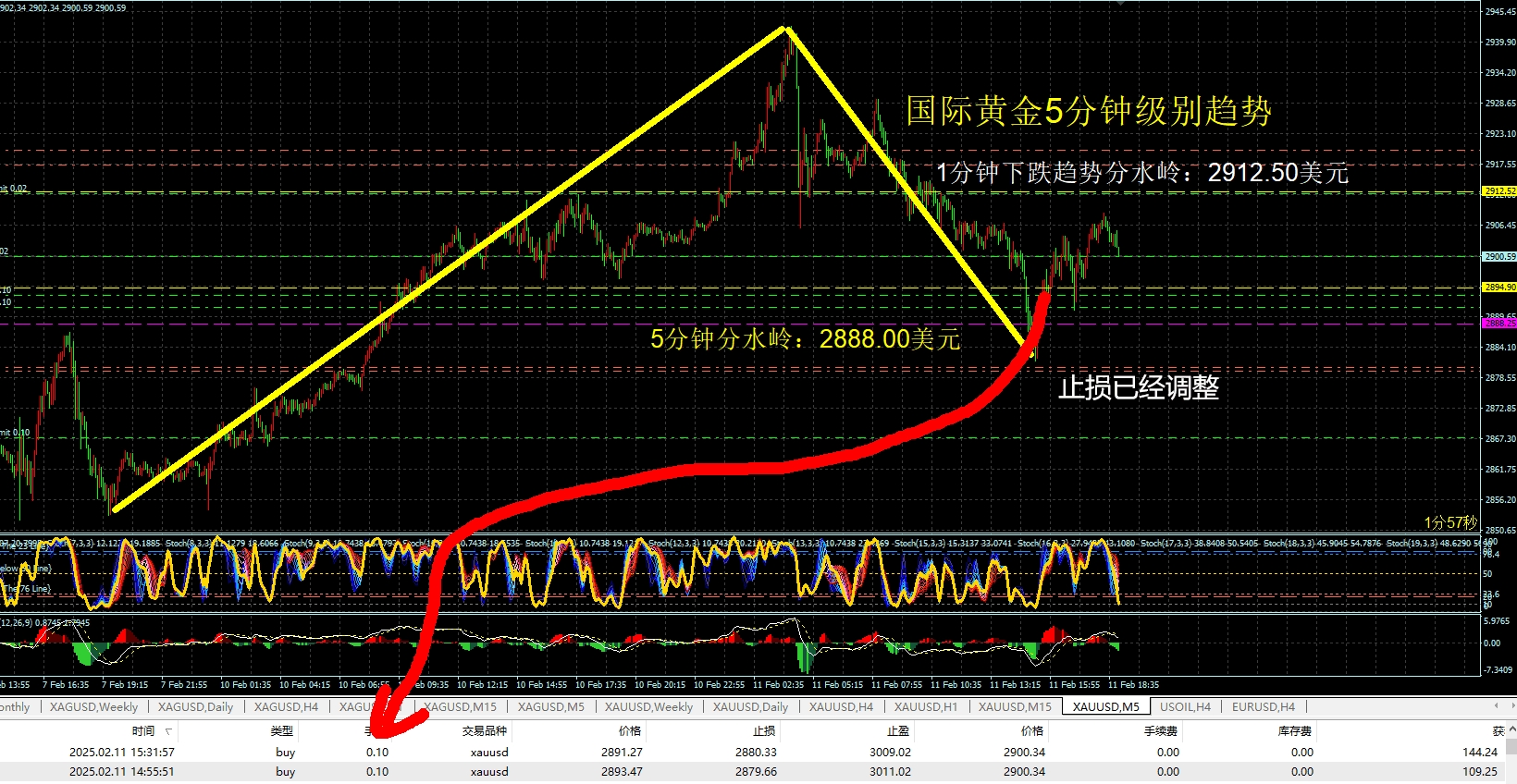 $黄金/美元(FORPM|XAU)$ 今天晚上直播了三个小时。国际黄金短期大幅回调了6000个点左右(相当于60美元的跌幅),盘中一度跌穿2888的分水岭,但力度还差一点,所以一直没有确认5分钟级别的趋势转空。之后,国际黄金迎来了小幅反弹,此时2888附近的多单止损也进行了推进。接下来就是看国际黄金要不要强势跌破2888的分水岭了,如果跌破这里,那5分钟趋势就转空了。#社区牛人计划#
