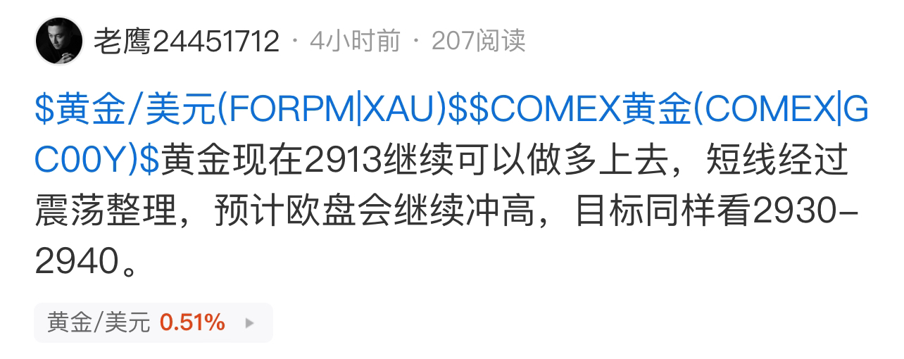$黄金/美元(FORPM|XAU)$ $COMEX黄金(COMEX|GC00Y)$ 黄金手里的多单,现在上来2920了,可以先出一波。晚间失业金数据,等回落机会2913左右再多进去,继续保持低多看涨的思路就行。
