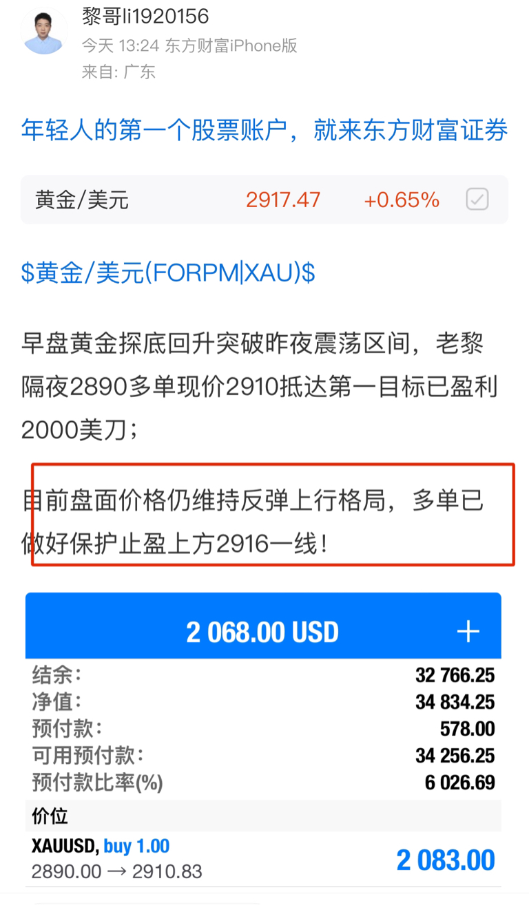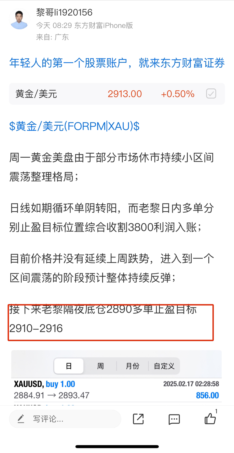 午后黄金持续反弹震荡上行格局,老黎隔夜2890进场多单如期兑换2916止盈位置拿下26$行情2600美刀利润入账;