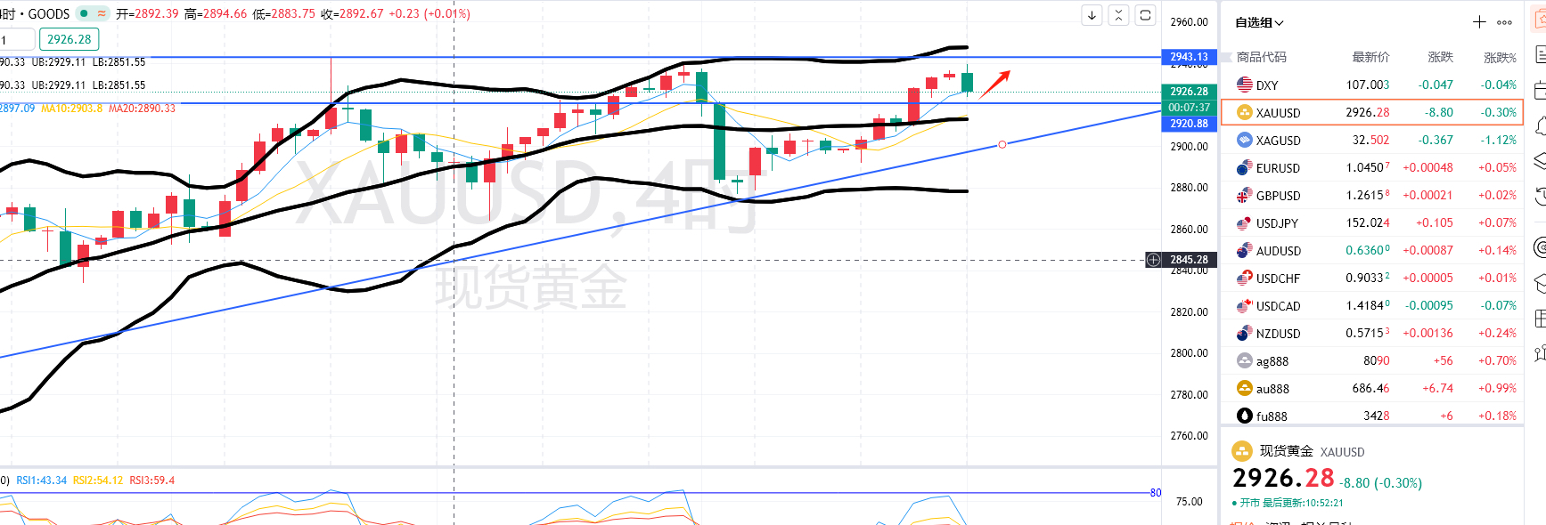日线中阳收复调整空间,趋势线支撑有效维持震荡上行节奏,短线仍有新高动能但需警惕反复。4小时级别维持高位震荡,未破区间前不宜追高。关键支撑2924,若前高压制有效则下看2913。