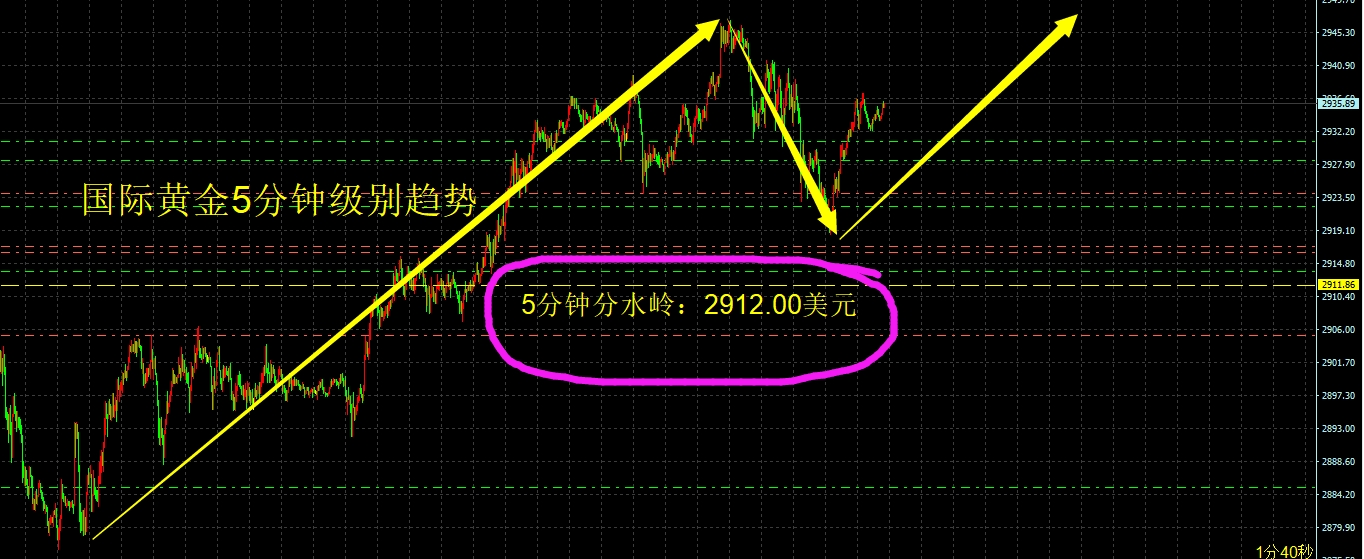 国际黄金昨天冲高回调,形成了5分钟级别上涨趋势的第2浪回踩动作,分水岭在2912