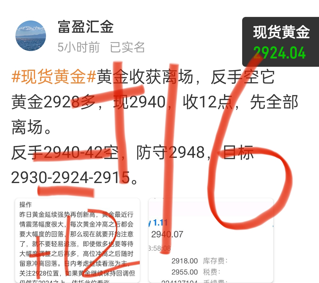 黄金如期下跌收割黄金2940空,现2924,第二目标抵达,收16点,减仓,留点底