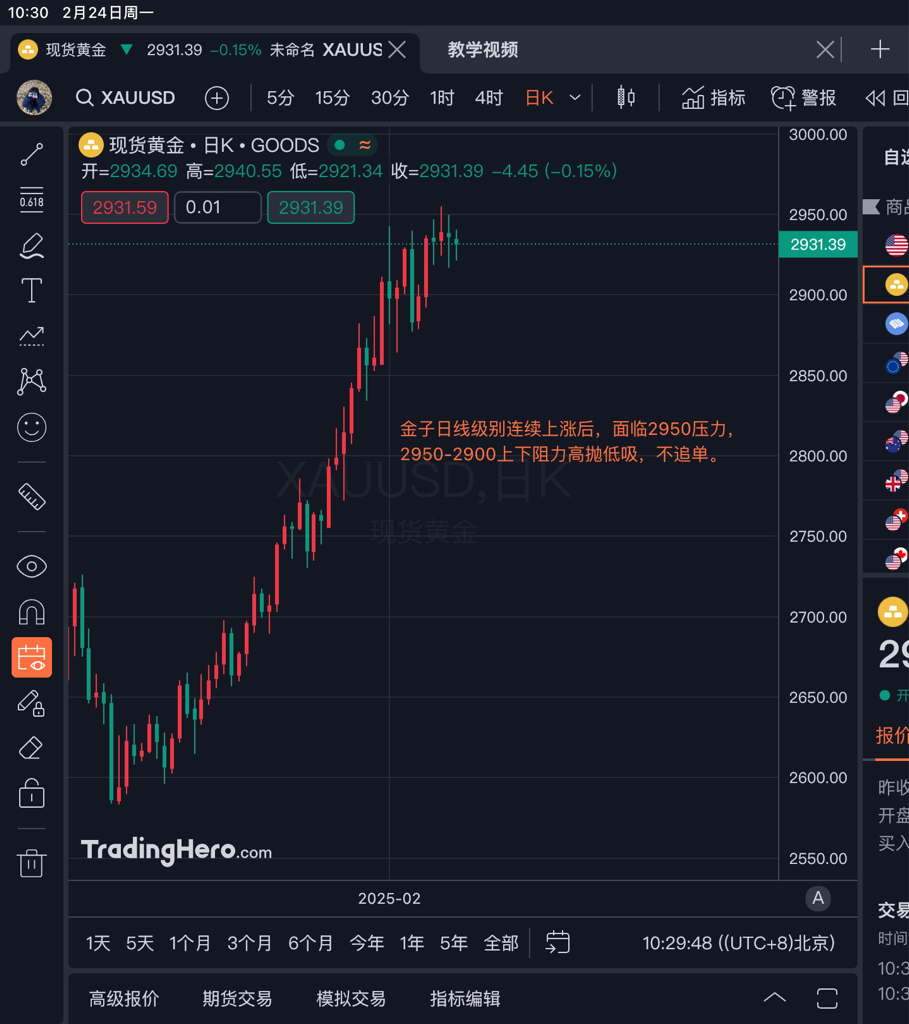 金子日线级别连续上涨后,面临2950压力,2950-2900上下阻力高抛低吸,不